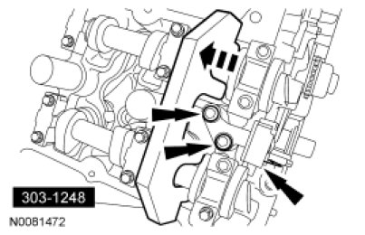 8. NOTE: It is necessary to tilt the Camshaft Holding Tool toward the rear of the engine to access the rearmost secondary timing chain tensioner bolt.