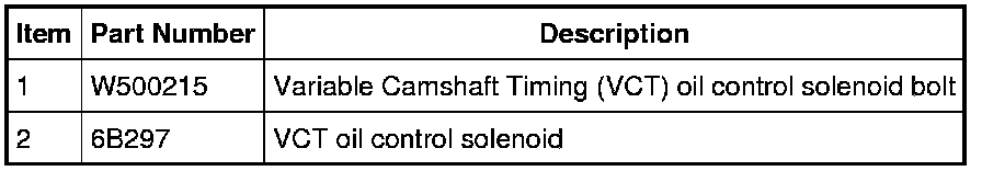 2. Remove the bolt and the Variable Camshaft Timing (VCT) oil control solenoid.