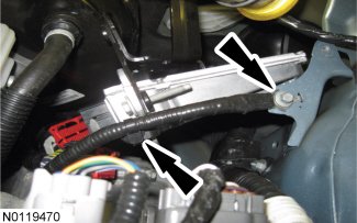 8. Remove the lower PCM bolt and the upper PCM bracket bolt.
