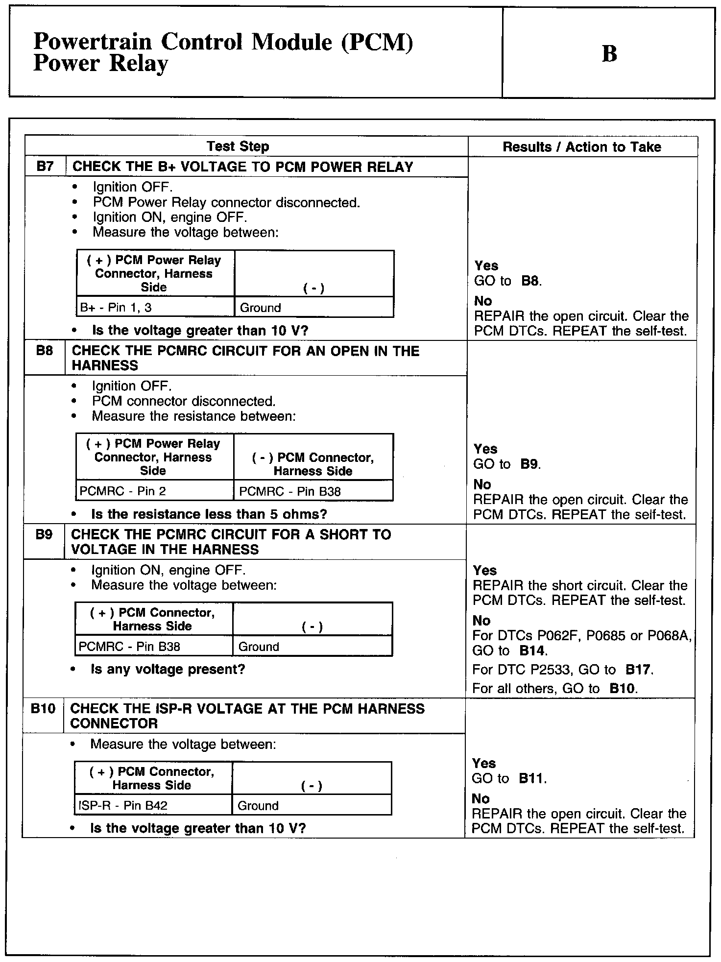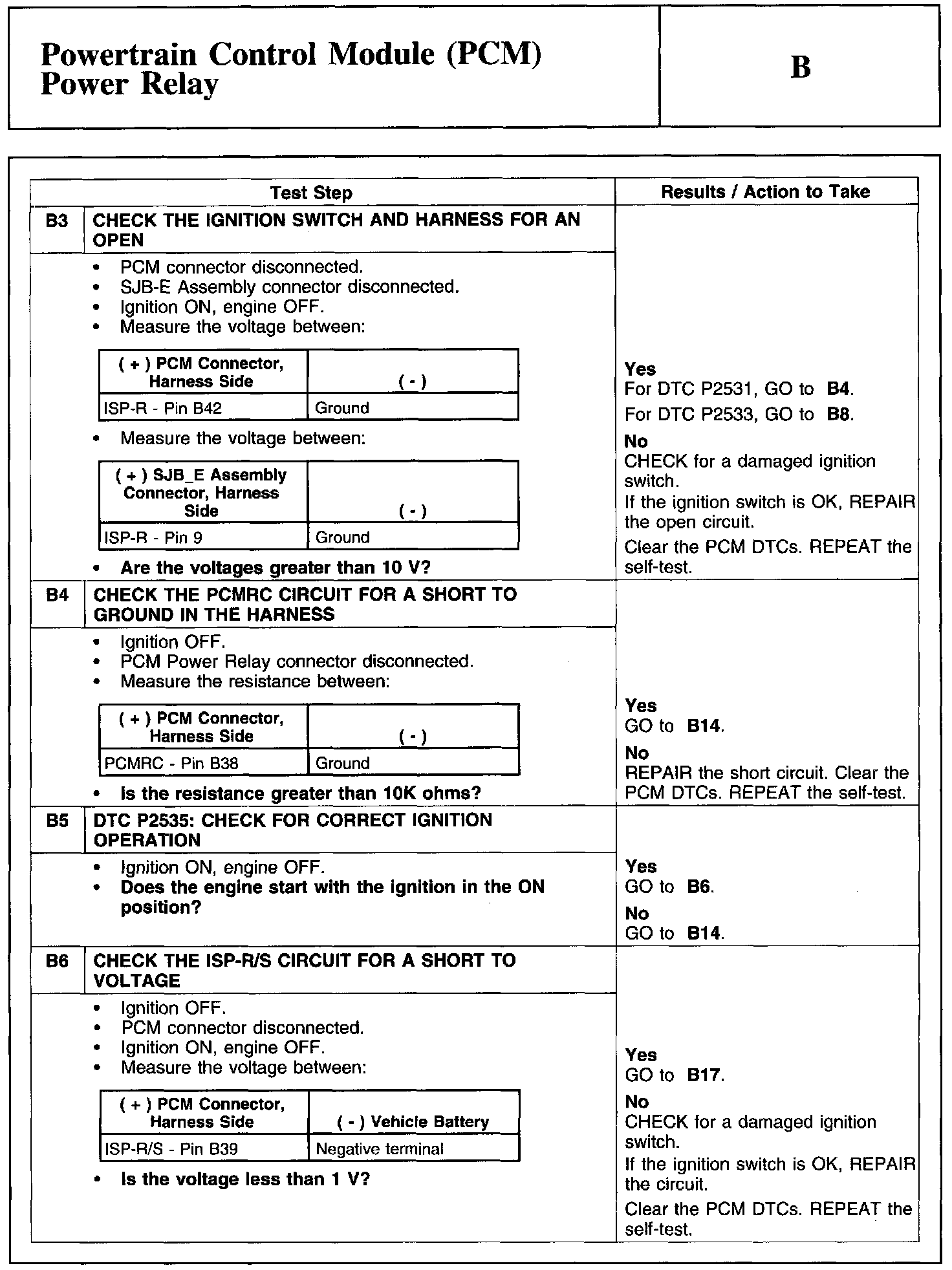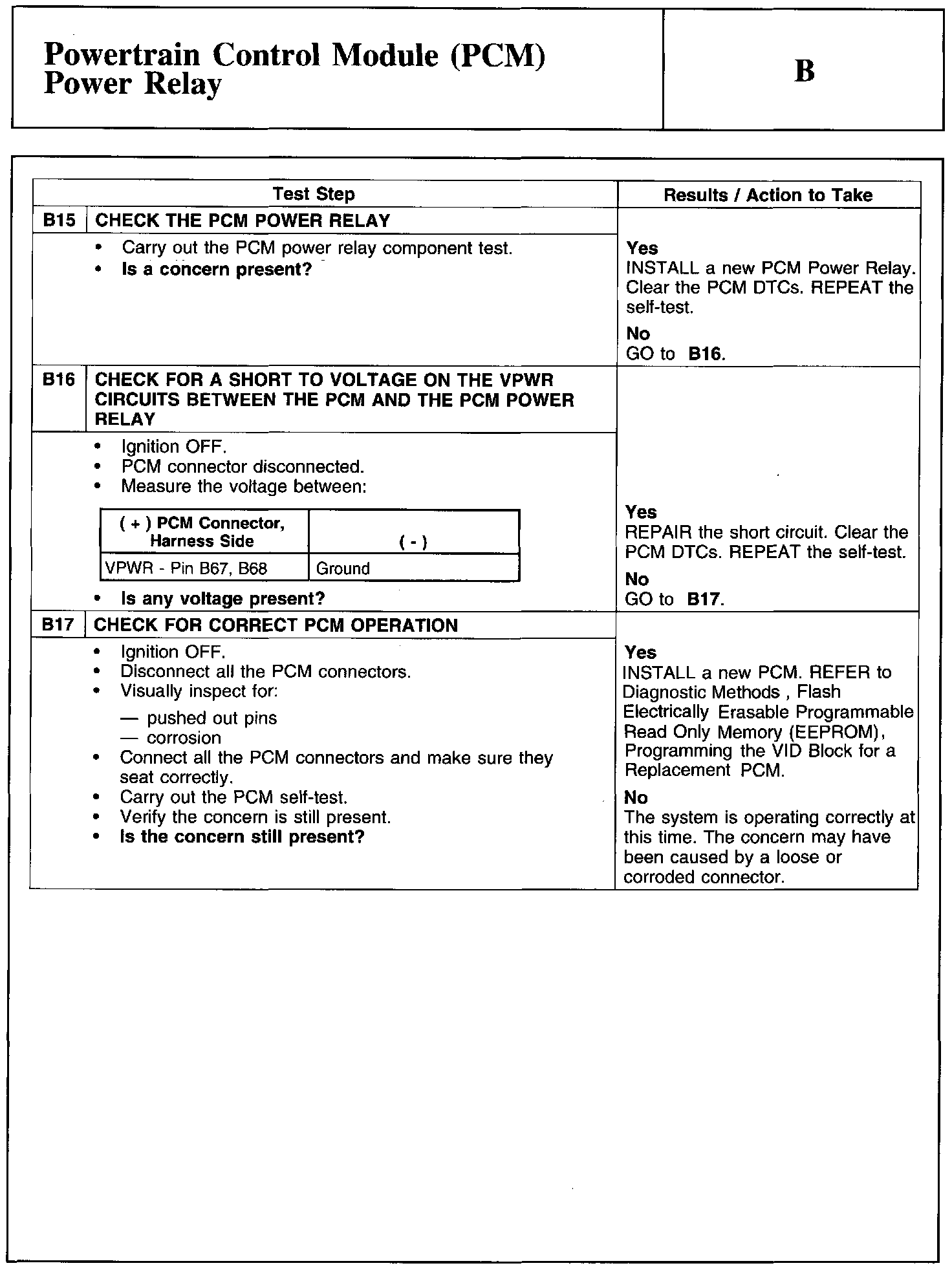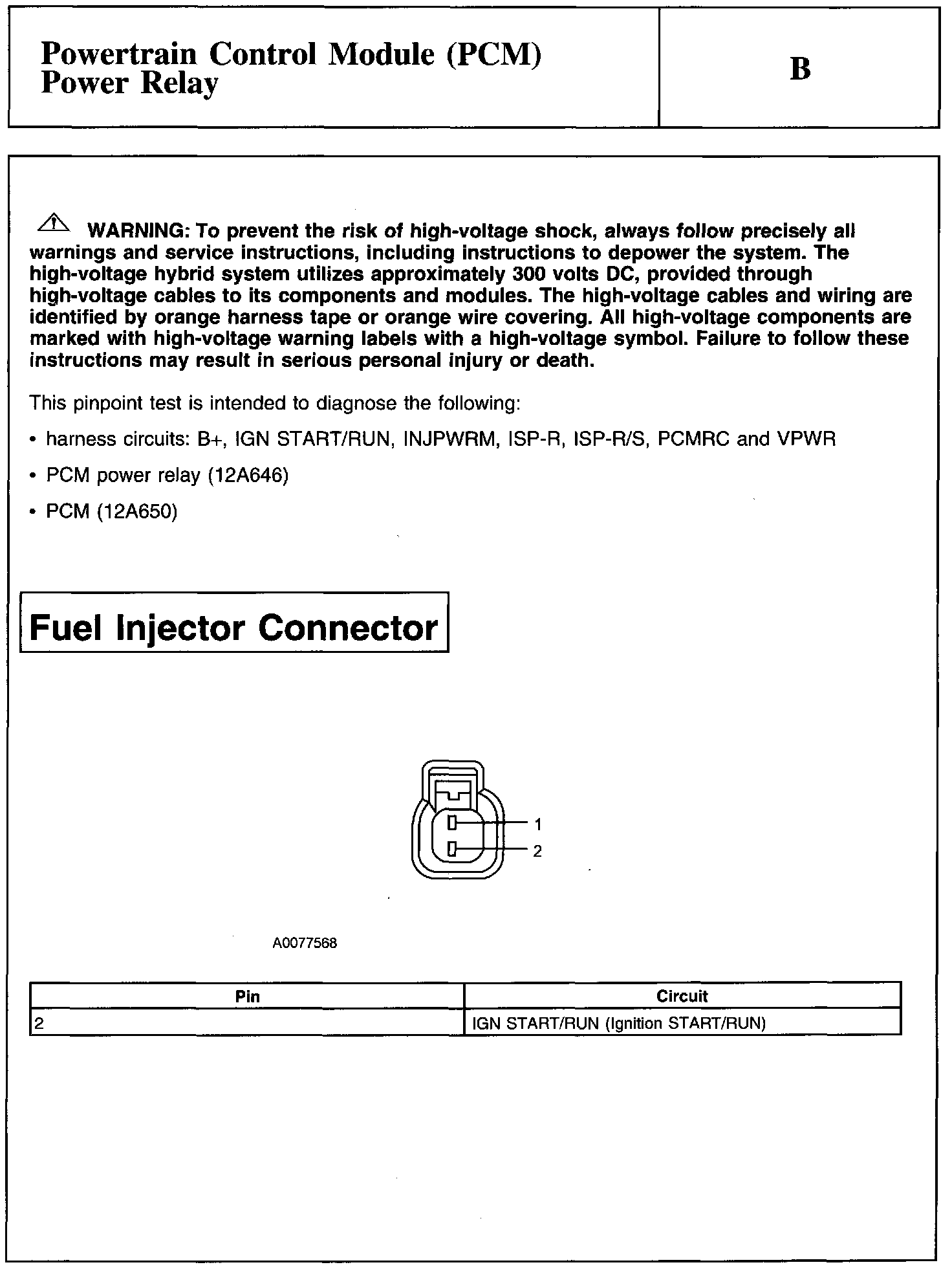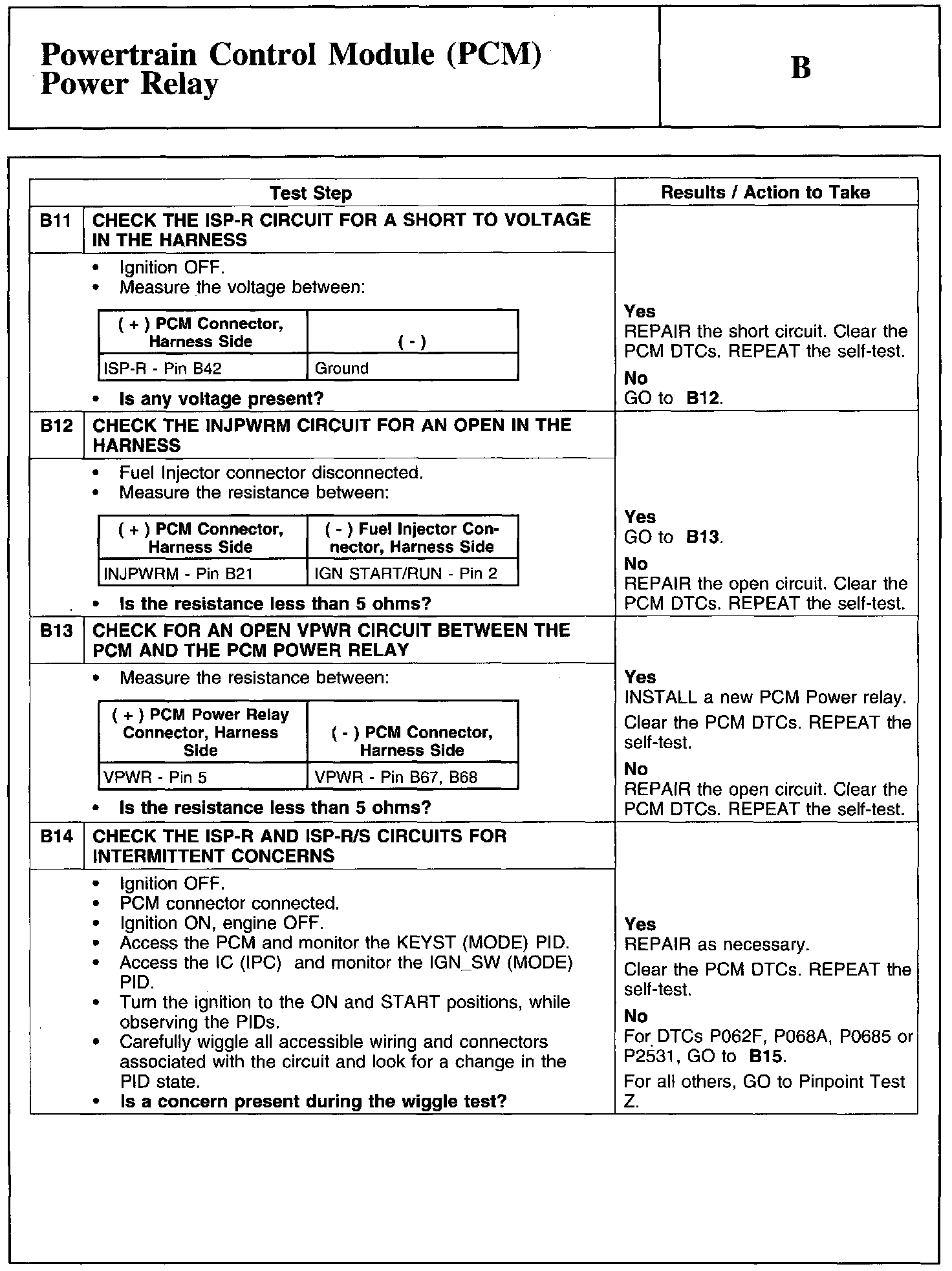 Home >> Ford >> 2011 >> Fusion FWD L4-2.5L Hybrid >> Repair and Diagnosis >> Powertrain Management >> Computers and Control Systems >> Testing and Inspection >> Pinpoint Tests >> Test B: Powertrain Control Module (PCM) Power Relay