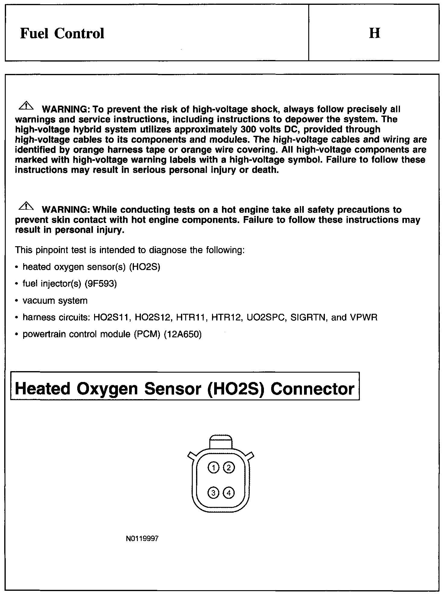 PINPOINT TEST H: FUEL CONTROLWarnings And Heated Oxygen Sensor (HO2S) Connector: