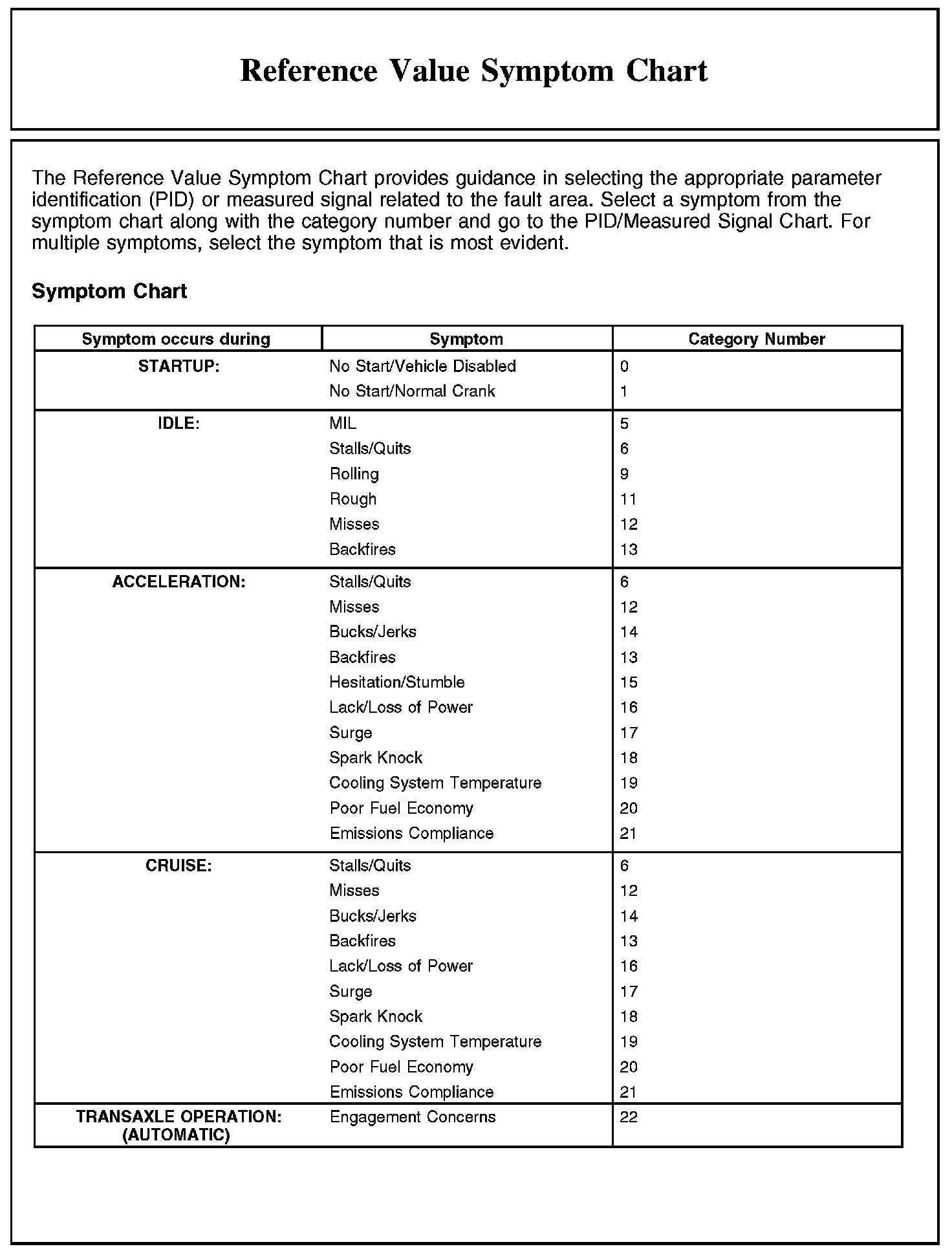 REFERENCE VALUE SYMPTOM CHART