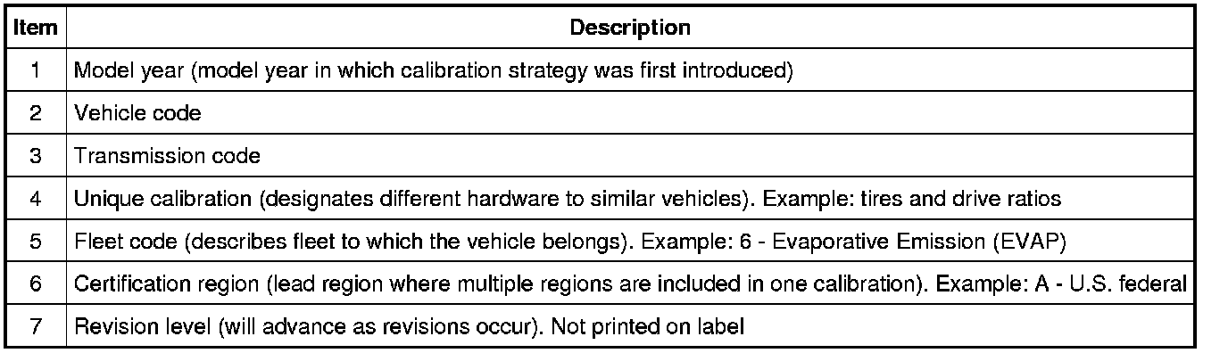 NOTE: Powertrain calibration information is limited to a maximum of 5 characters per line on the Vehicle Certification (VC) label. Because of this, calibration identification consisting of more than 5 characters will wrap to the second line on the VC label.