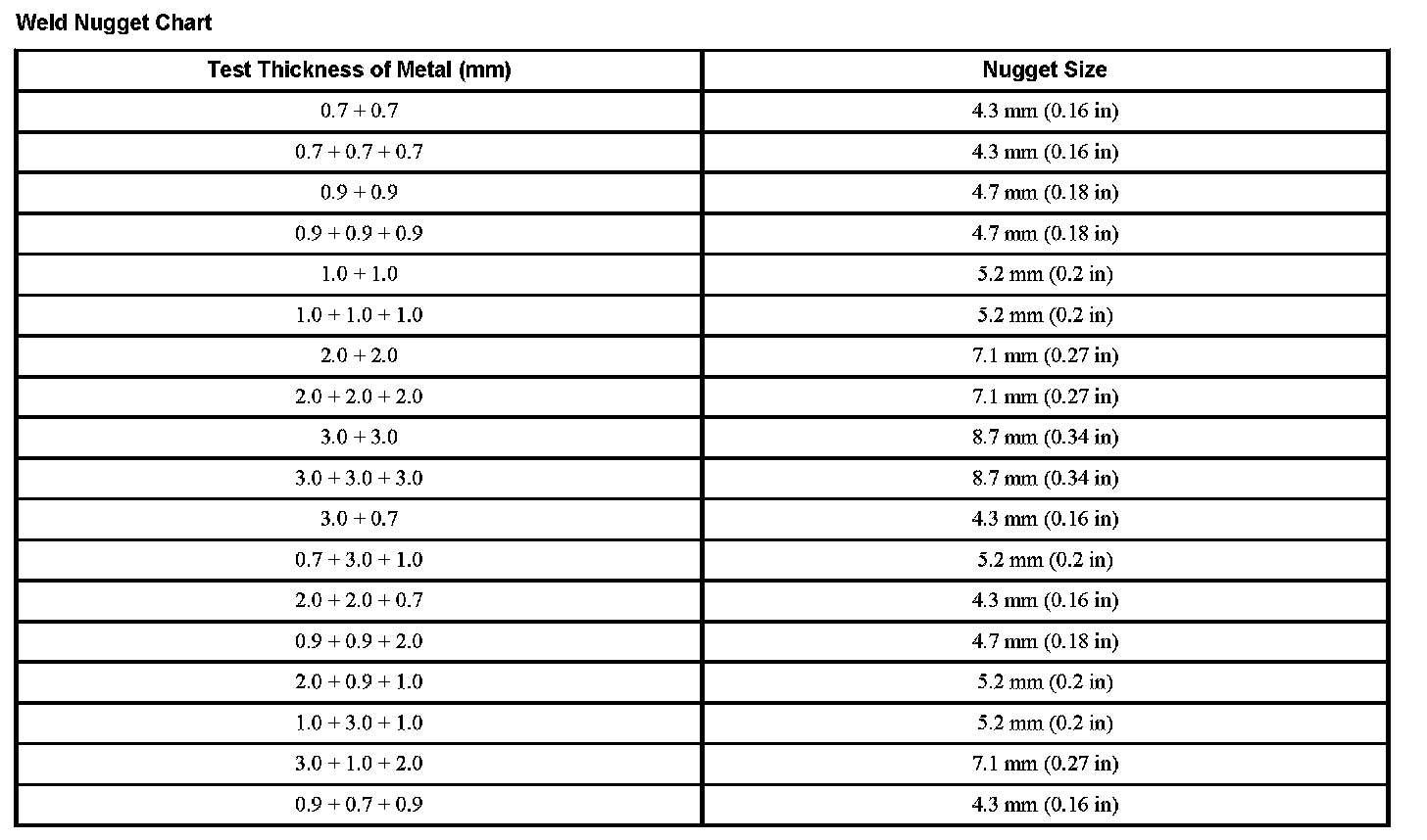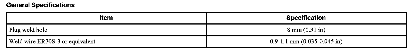 - Factory spot welds may be substituted with either STRW or MIG plug welds. Spot/plug welds should equal factory welds in both location and quantity. Do not place a new spot weld directly over an original weld location. Plug weld hole should equal 8 mm (0.31 in) diameter.