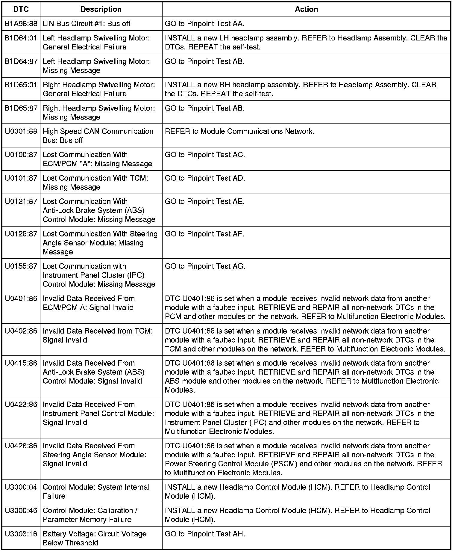 Home >> Ford >> 2011 >> Fusion FWD L4-2.5L >> Repair and Diagnosis >> Lighting and Horns >> Testing and Inspection >> Headlamp Control Module (HCM) DTC Chart