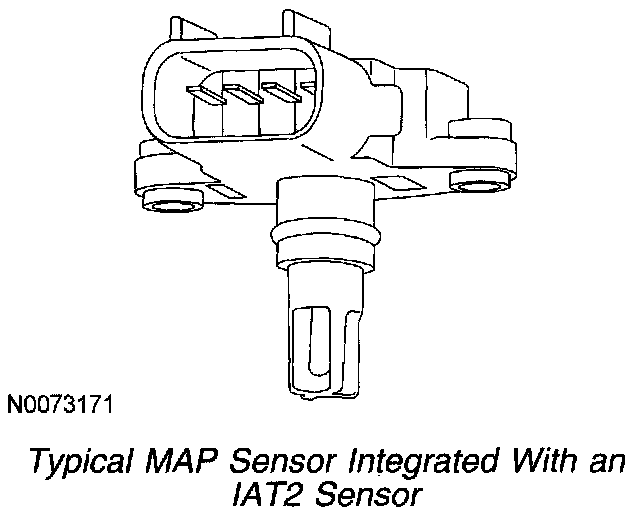 The MAP sensor for speed density control systems is centrally located on the intake manifold and measures the intake manifold pressure. The PCM uses this information to determine the speed density air charge and to provide input for various spark control functions. The MAP sensor for a speed density system is integrated with the IAT2 sensor.