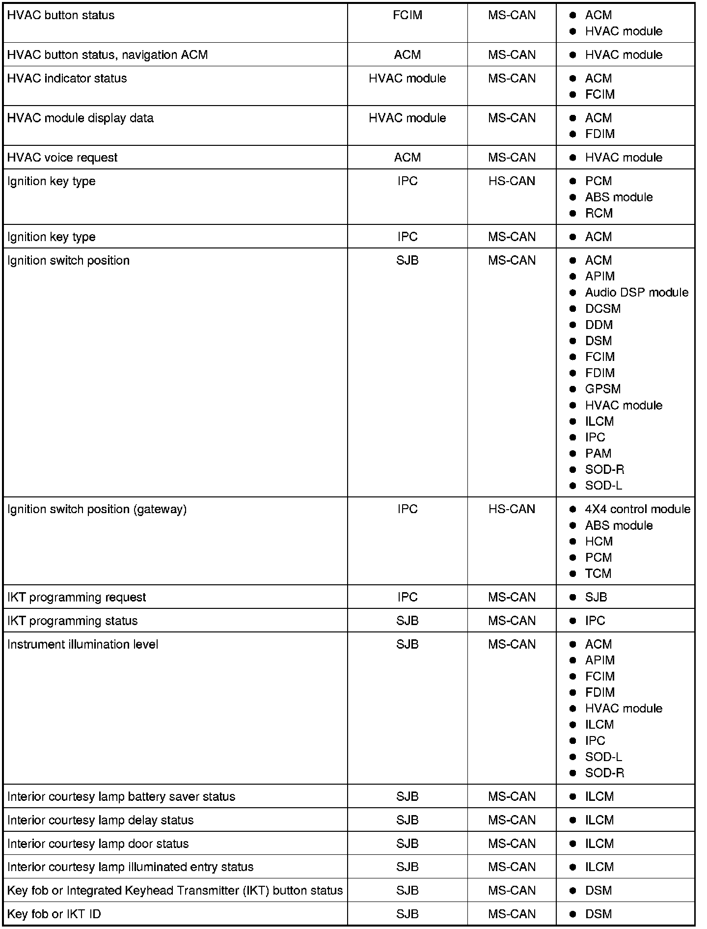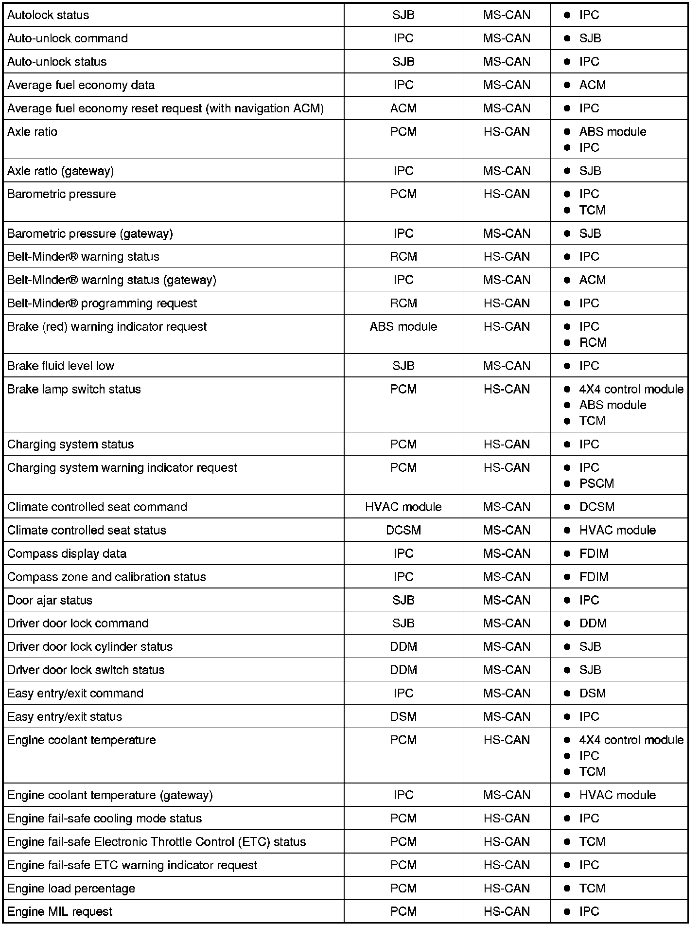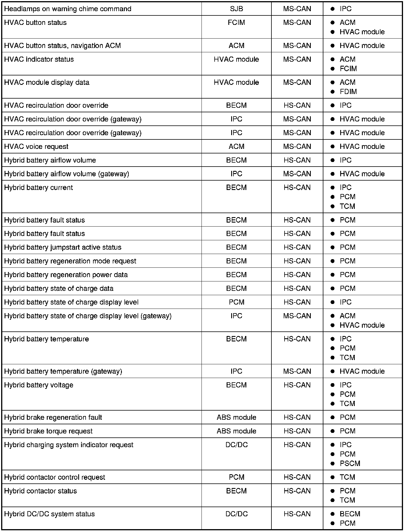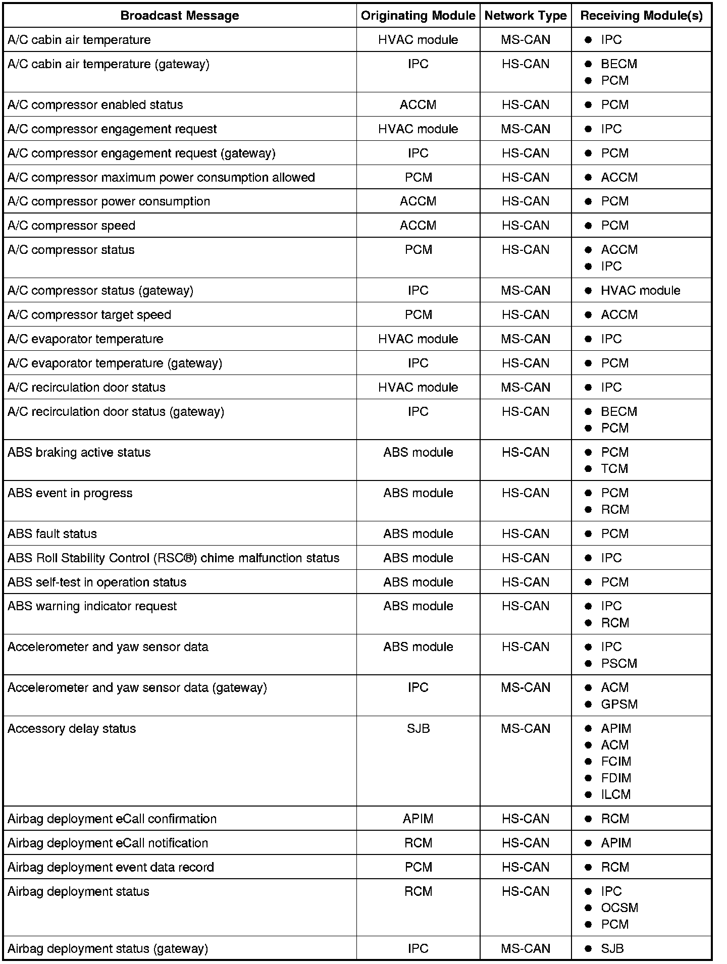 NOTE: This chart describes the specific HS-CAN and MS-CAN messages broadcast by each module, and the module(s) that receive the message.