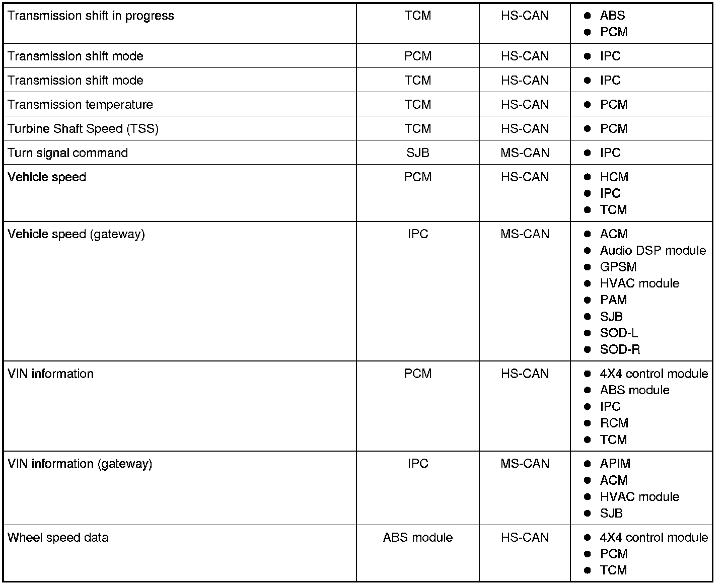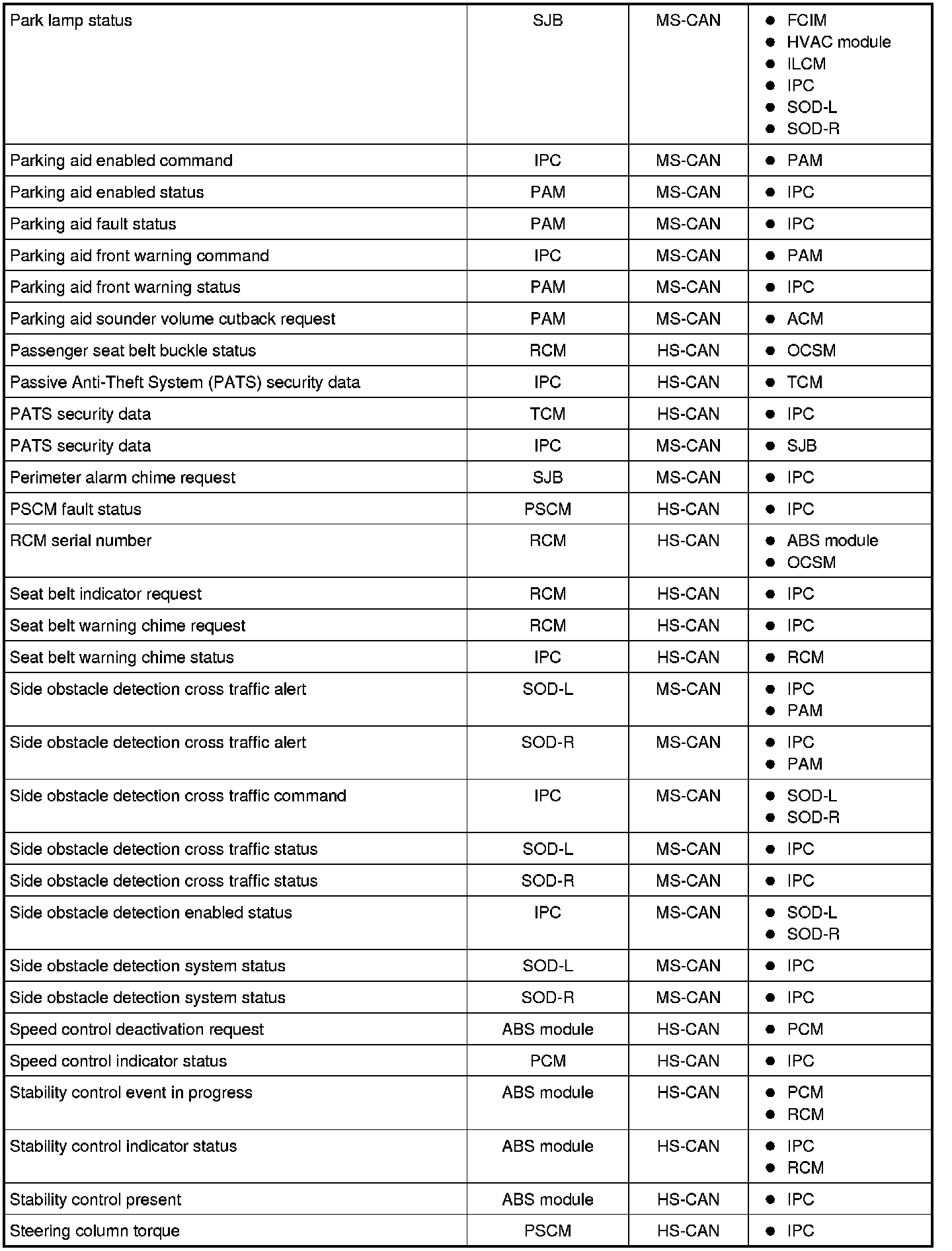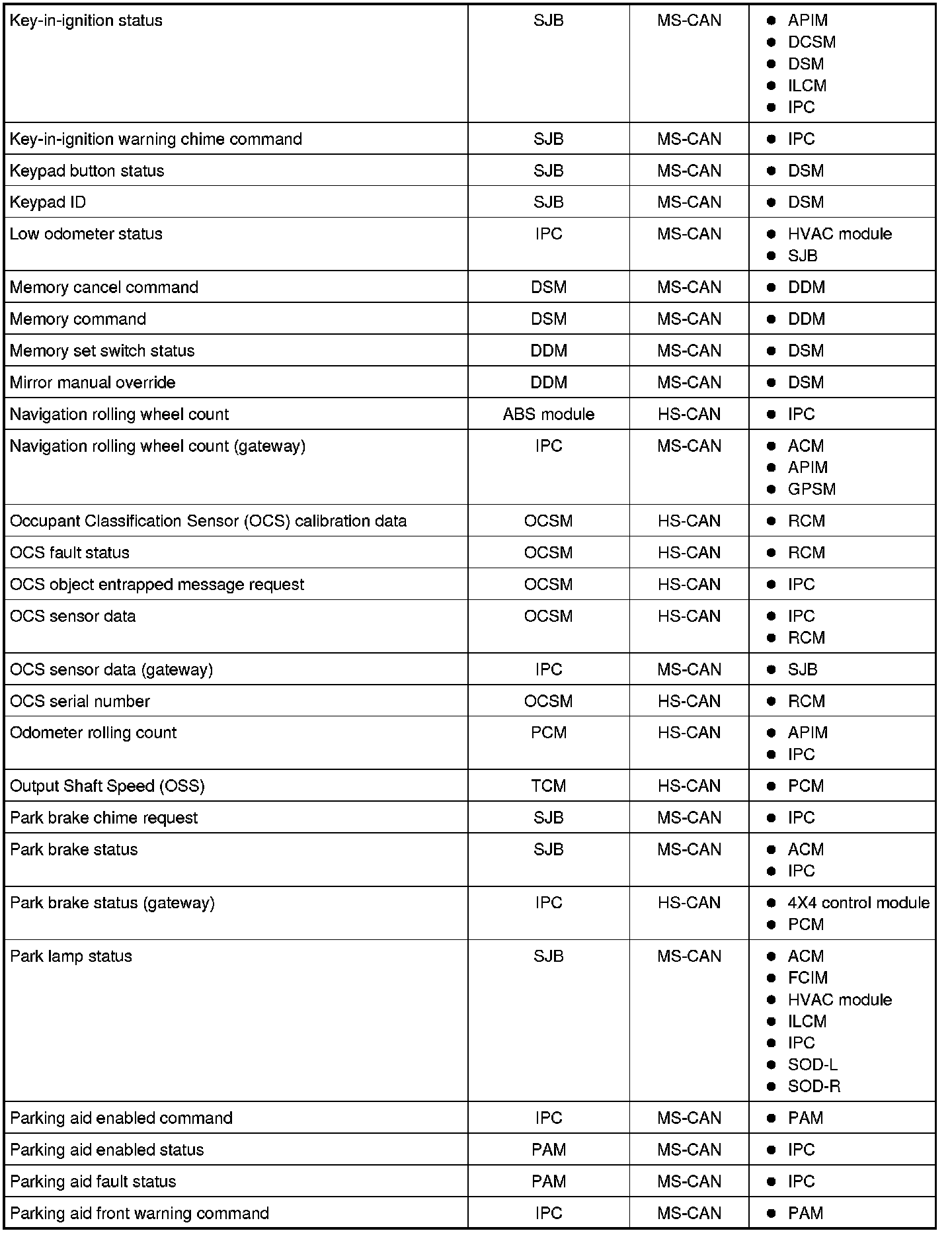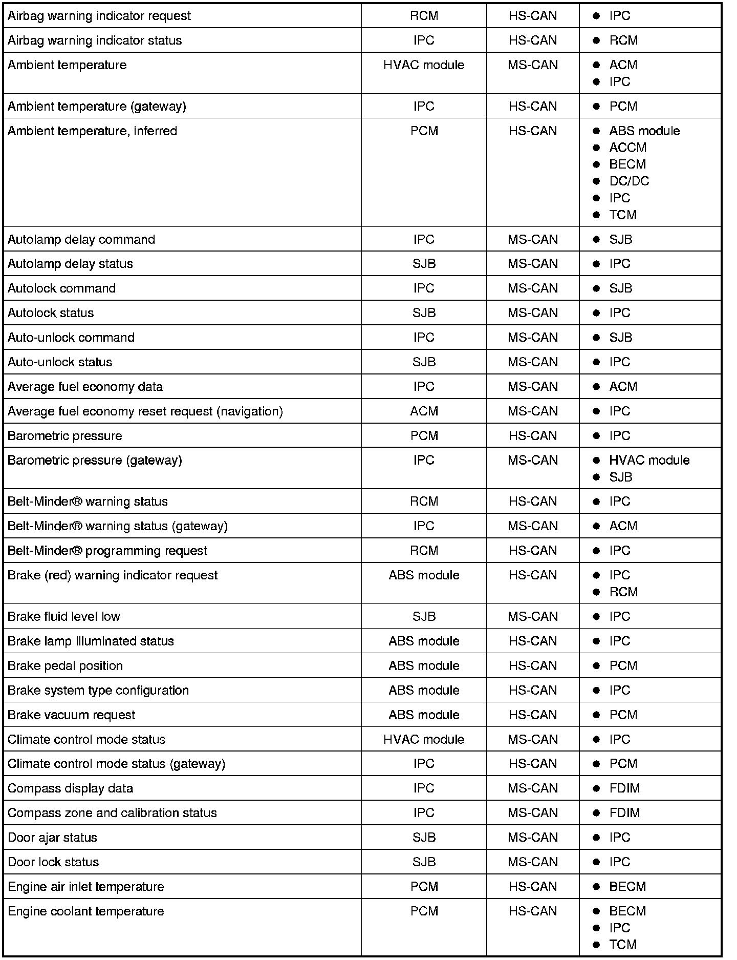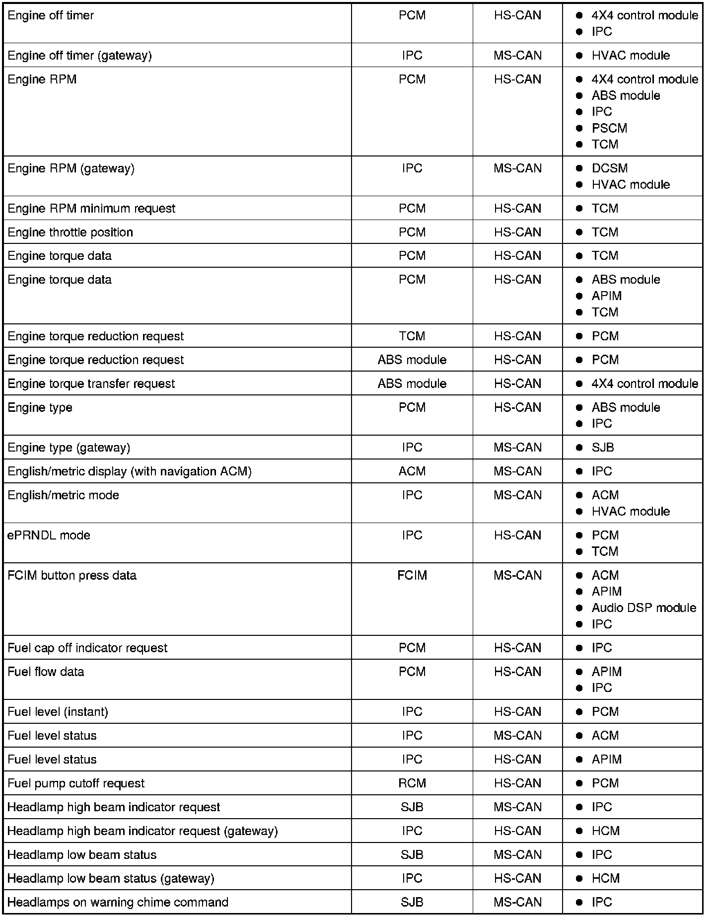 NOTE: This chart describes the specific HS-CAN and MS-CAN messages broadcast by each module, and the module(s) that receive the message.