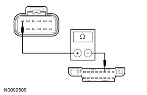 - Measure the resistance between the TCM C1458a-1, circuit VDB04 (WH/BU), harness side and the DLC C251-6, circuit VDB04 (WH/BU), harness side.