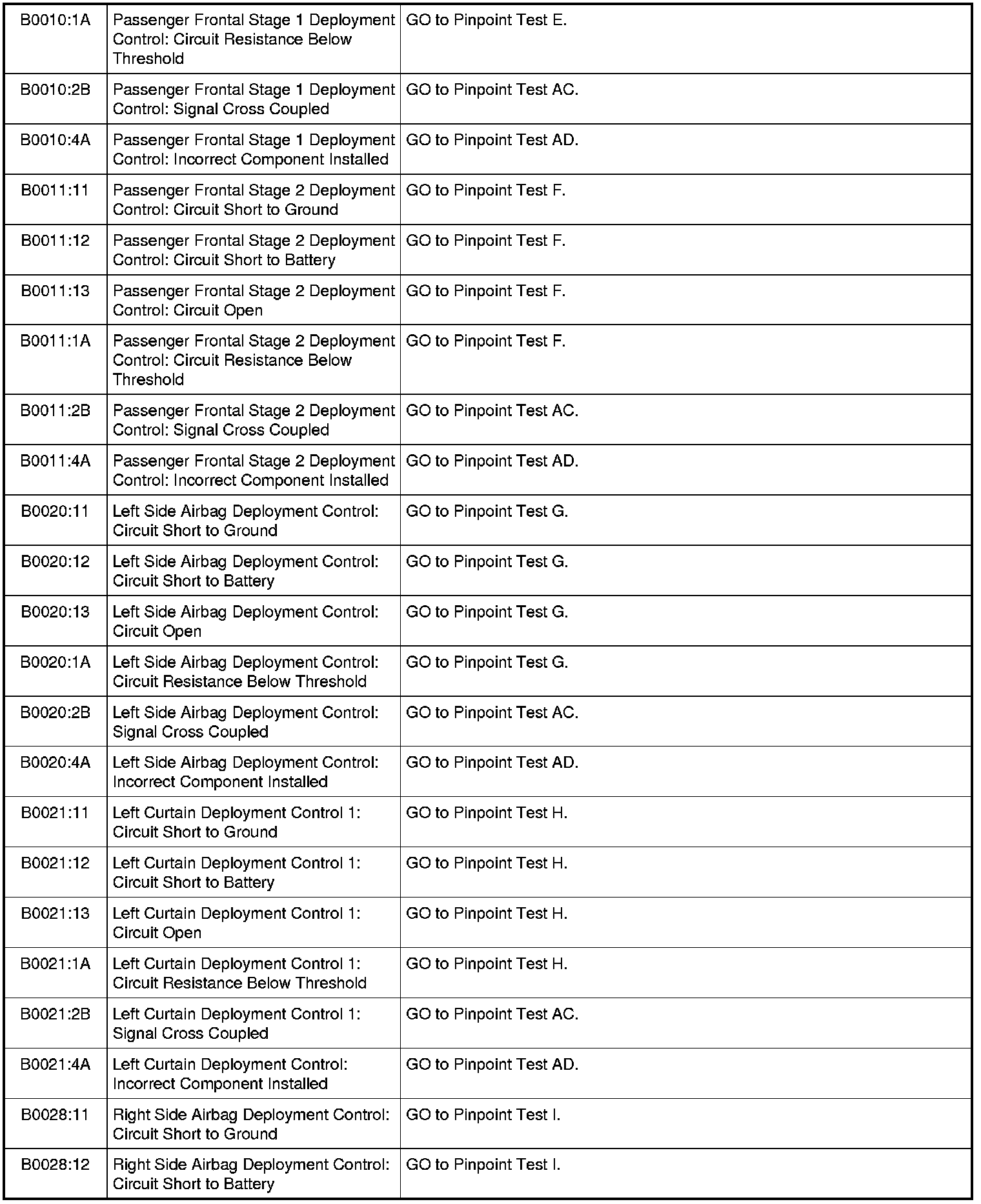 Restraints Control Module (RCM) DTC Chart
