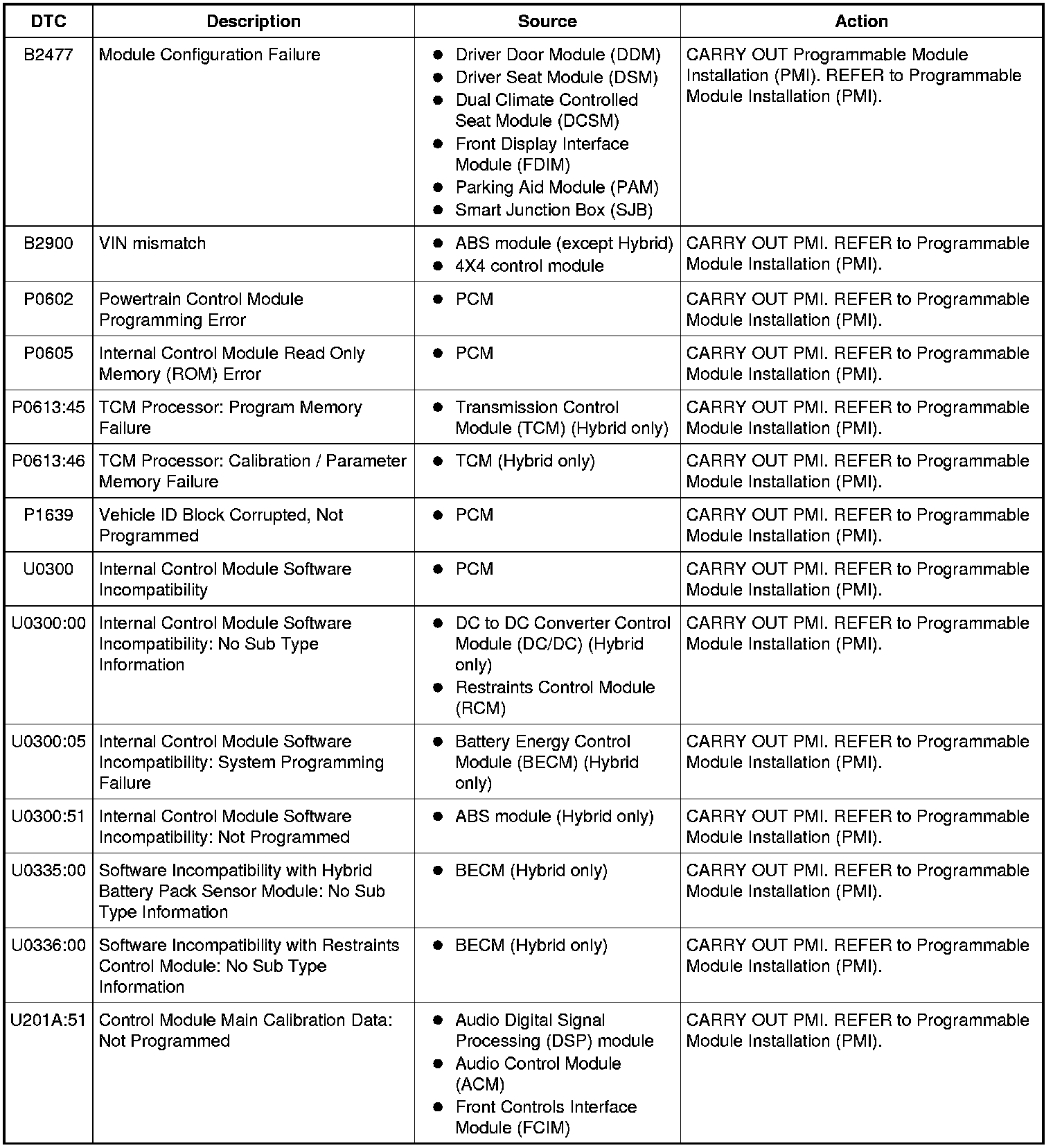 Home >> Ford >> 2011 >> Fusion FWD V6-3.5L >> Repair and Diagnosis >> Powertrain Management >> Computers and Control Systems >> Information Bus >> Testing and Inspection >> Diagnostic Trouble Code Tests and Associated Procedures >> Module Configuration - DTC Charts
