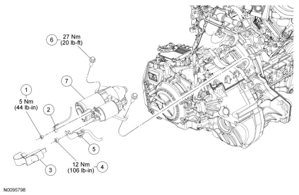 4. Remove the starter motor solenoid battery cable nut and position aside the cable.