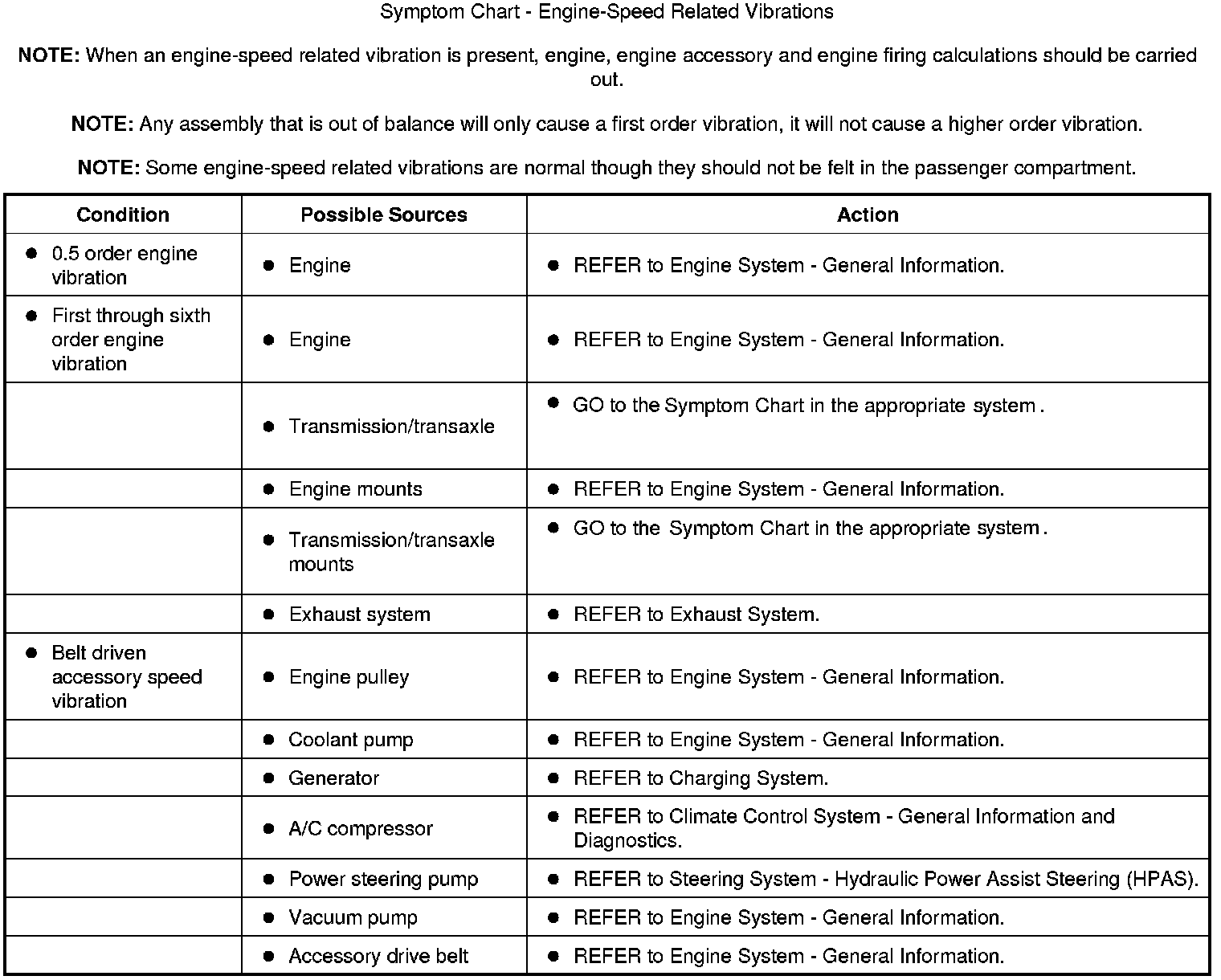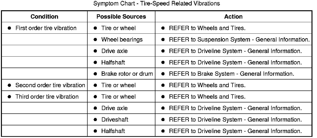 Use the diagnostic instructions along with the necessary listed tools to identify the vibration order and to isolate the symptom and the possible systems associated with that symptom. Then based on the results from the road test, make a determination of which action in the symptom chart to take first. Since it is possible any one of multiple systems may be the cause of the symptom, it may be necessary to use a process of elimination type diagnostic approach to pinpoint the concern. Refer to the system(s) indicated to identify and isolate the cause or rule that system out as being the causal system for the symptom.