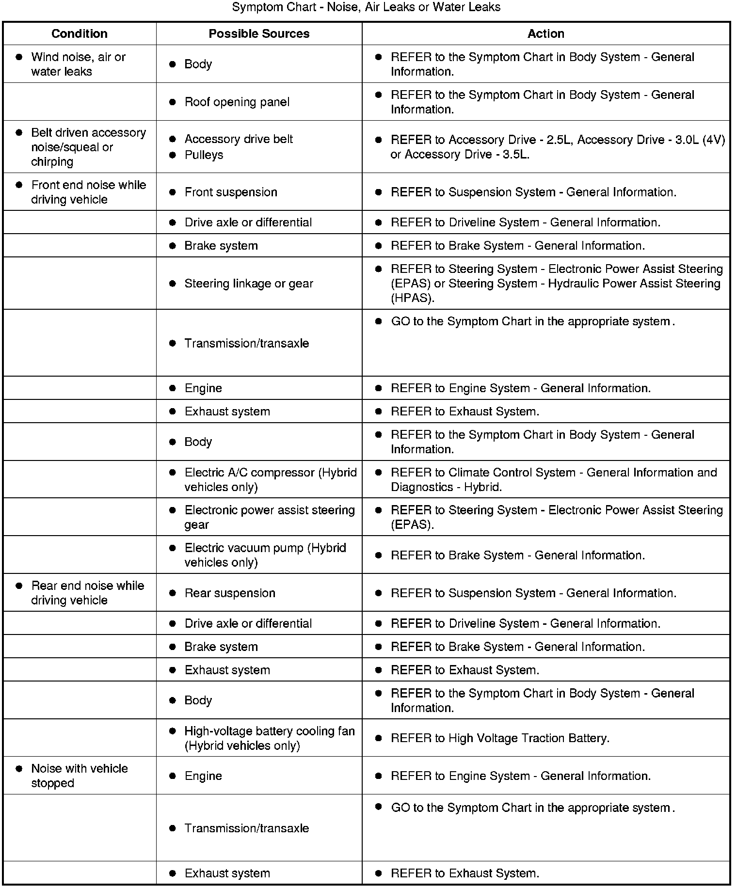 Symptom Chart - Noise, Air Leaks or Water Leaks