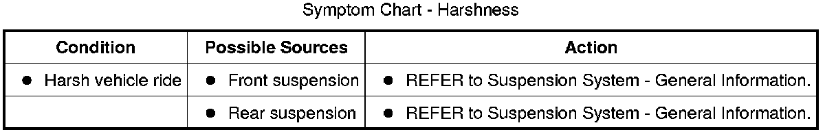 Harshness is customer perception which gives the impression of no isolation from the tire/wheel and suspension system. Harshness may be caused by road conditions, temperature changes, component damage and/or incorrect customer modifications on original components/specifications. Customers usually experience harshness when the vehicle is driving over bumps or potholes and in cold weather conditions. Harshness can also be experienced with excessive tire pressure, sporty tires, heavy-duty springs and shocks, or other vehicle modifications. Some aftermarket tires, even with the correct size, may change vehicle behavior and produce customer concerns. The first step in diagnosing a harshness concern is to determine if the concern was experienced only in certain specific operating conditions, such as large potholes or extremely cold weather. In these cases, harshness should be considered normal. A known good vehicle can be driven under the same conditions and the rides can be compared to determine whether the concern is normal or vehicle specific. The second step is to check tire pressure and make sure it was set within vehicle specifications. The third step is to inspect for aftermarket or modified components and determine if they are the cause of the harshness complaint. If the harshness concern persists after the above steps, it is possible that some components are damaged. Based on the results from the road test, make a determination of which action in the symptom chart to take first.
