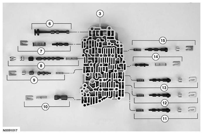 - Compress the valve springs with a screwdriver and remove the retainers with a magnet. Use a pick to remove the bypass valve retainer. Remove the individual valves and springs from the main control valve body by tapping the valve body on the palm of the hand to slide the valves out of the bores. If needed, use a 4-mm bolt to thread into the valves to remove the valves. See Figure the Valve Body illustration for valve and spring locations. Clean valves, springs and main control valve body.