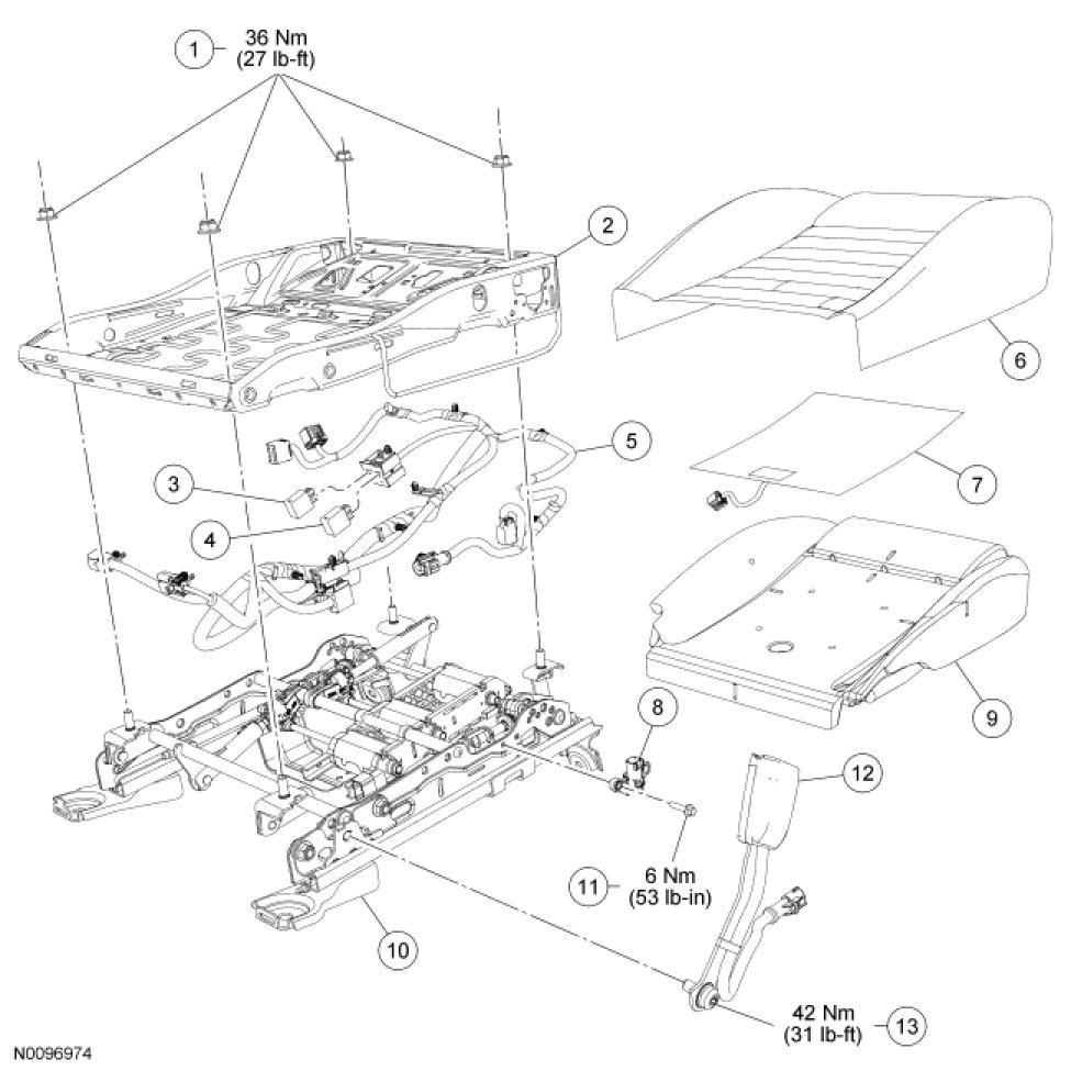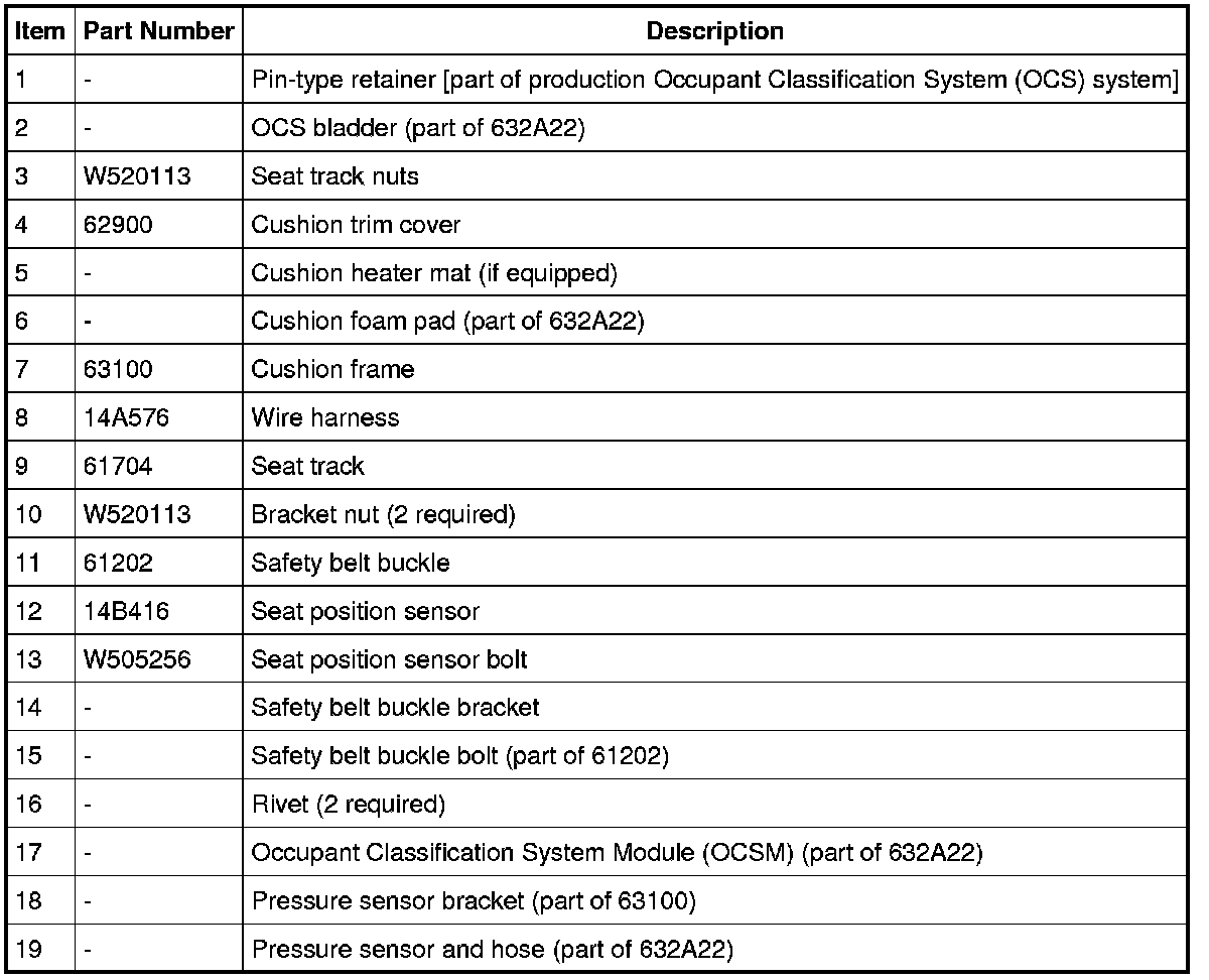 NOTE: Production Occupant Classification System (OCS) system is shown. For OCS system service kit, refer to Occupant Classification Sensor procedure in Supplemental Restraint System Service and Repair.