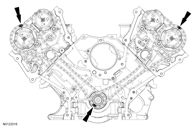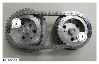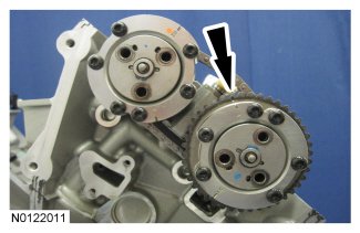 The timing mark on the intake VCT assembly should align between the 2 consecutive colored links.