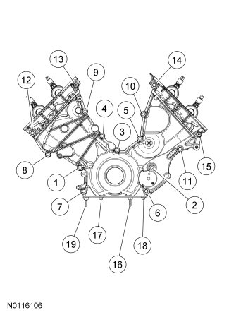 Stage 1: Tighten bolts 1-15 to 25 Nm (18 lb-ft) and bolts 16-19 to 10 Nm (89 lb-in).