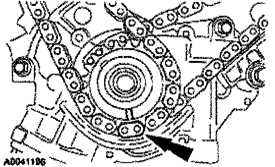 Position the LH (inner) timing chain onto the crankshaft sprocket, aligning the one colored link on the timing chain with the slot on the crankshaft sprocket.