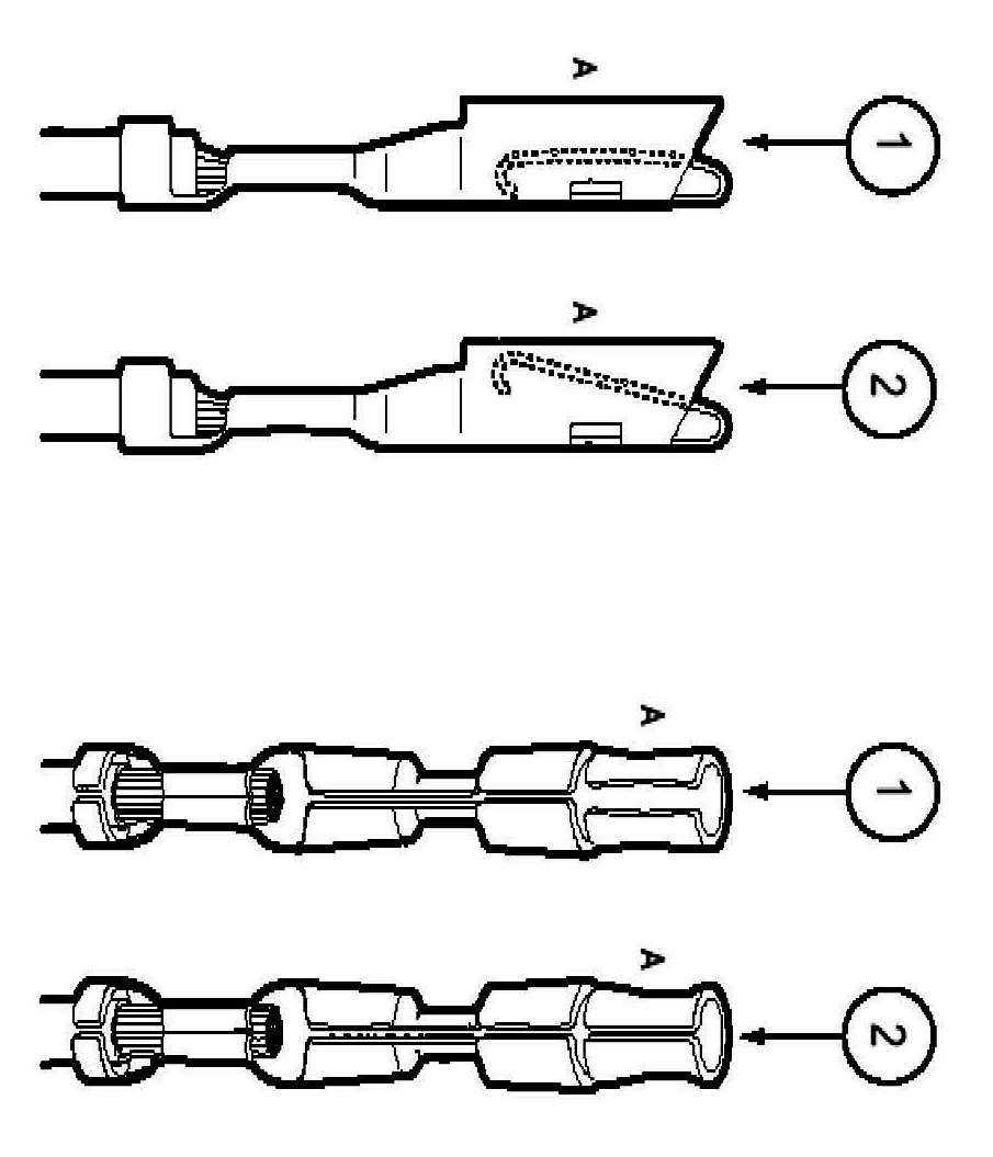 - Use heat shrinkable tubes marked with ES-1 (16-22 GA) or ES-2 (10-18 GA) to seat wire splice.