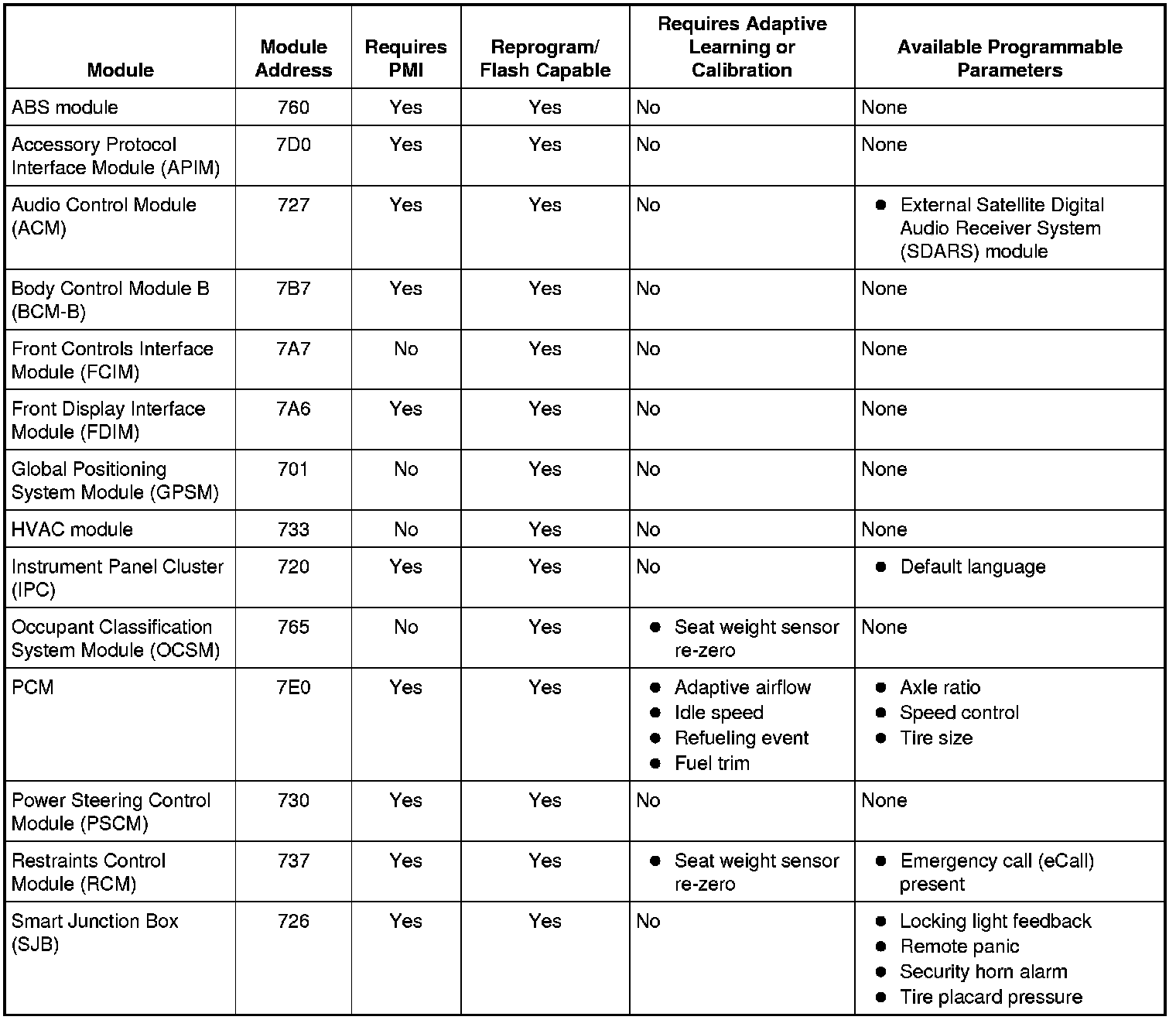 Programmable parameters are customer preference items that may be modified by the dealer via the scan tool or in some cases, modified by the customer following a procedure listed in the Owner's Literature. While many configuration options may exist for a module, only a few of these options are programmable parameters.