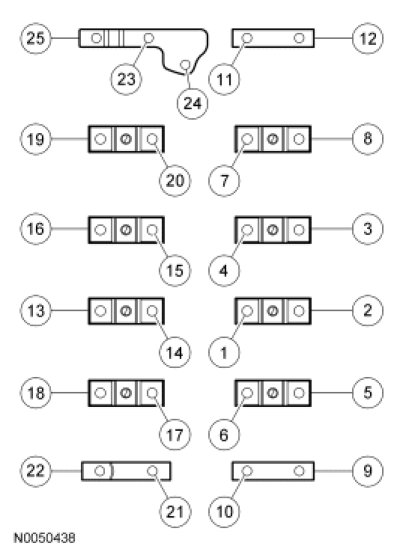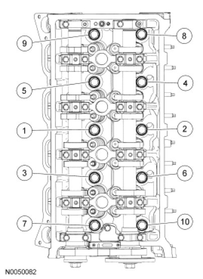 Install the bearing cap bolts and tighten in the sequence shown to 10 Nm (89 lb-in).