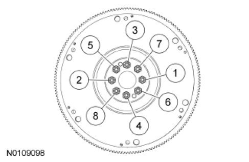 Tighten the flywheel bolts evenly in the sequence shown to fully seat the
