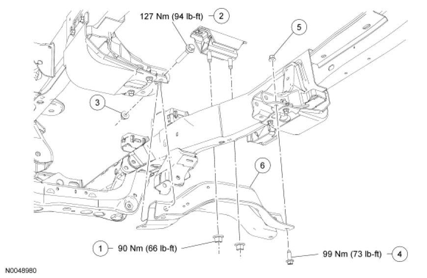 4. NOTE: Four-Wheel Drive (4WD) transmission support crossmember shown, Rear Wheel Drive (RWD) transmission support crossmember similar.