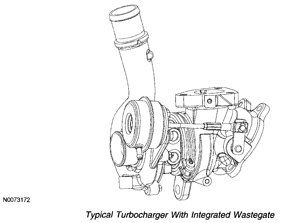 The TC wastegate regulating valve solenoid allows the PCM to indirectly control the turbocharger wastegates. The TC wastegate regulating valve solenoid controls the feedback pressure to a pneumatically powered wastegate diaphragm in order to control the boost pressure limit. When the compressor outlet pressure is allowed to increase, a pneumatically powered actuator opens each turbocharger wastegate and limits compressor outlet pressure.