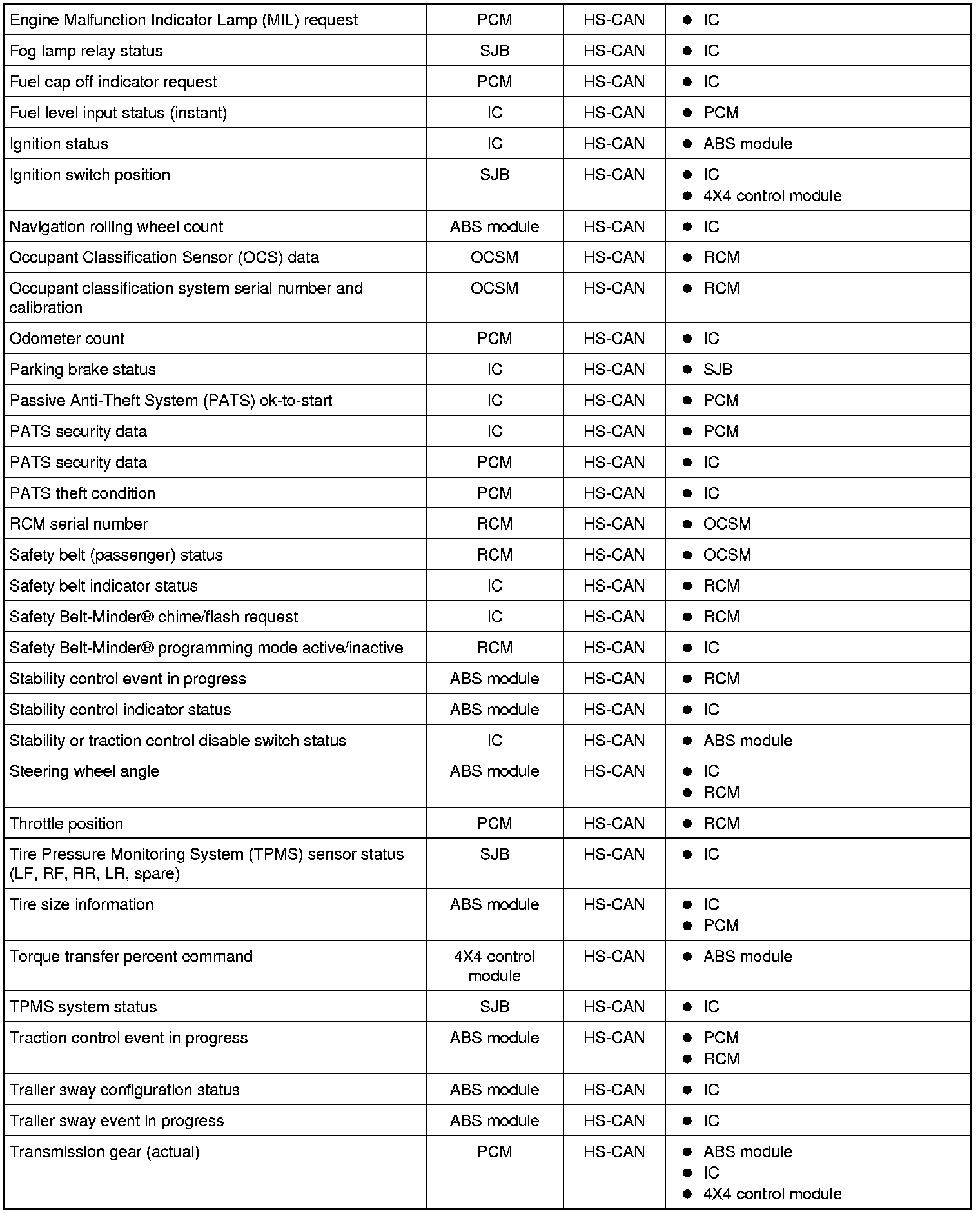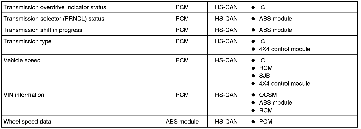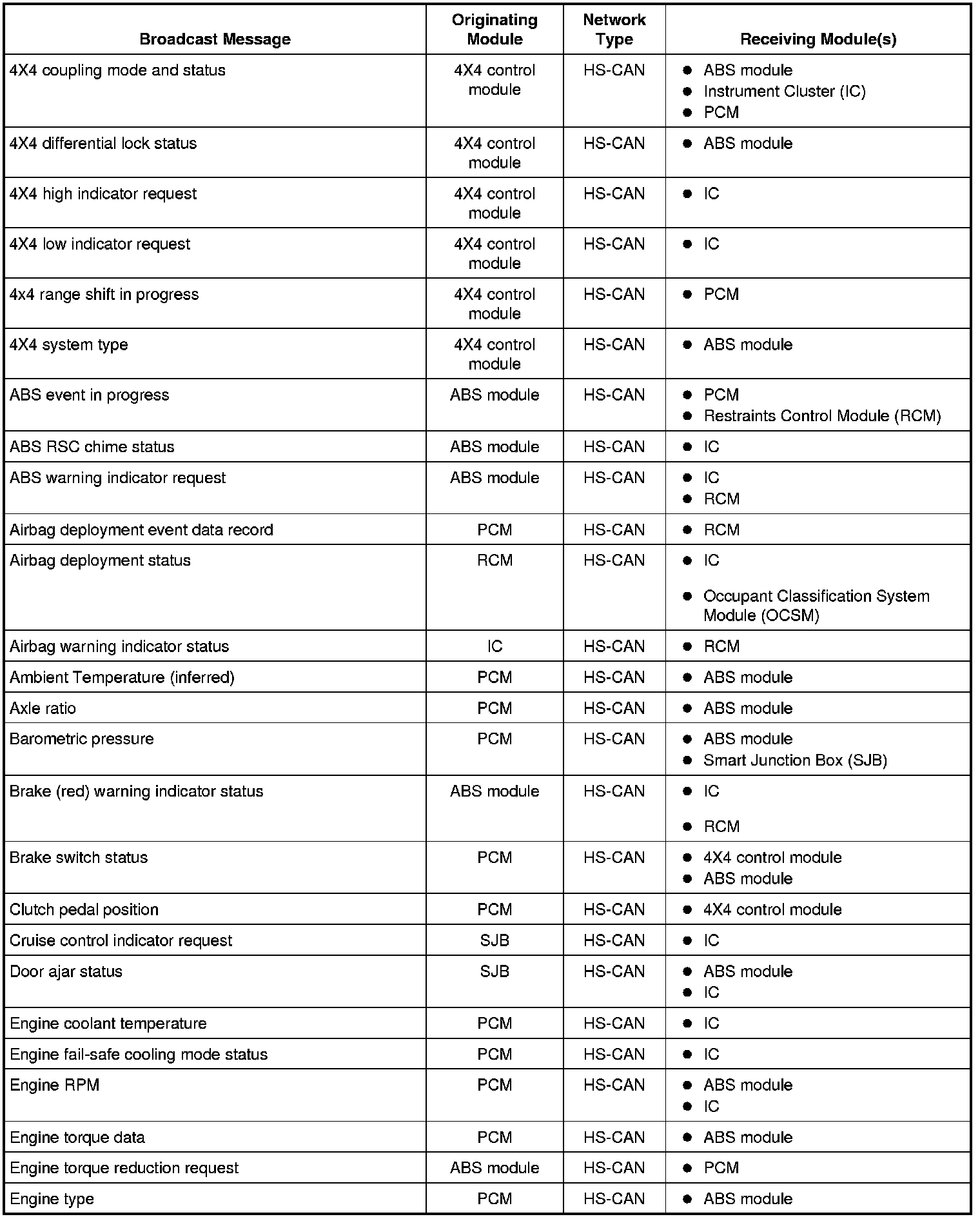 Modules on the CAN utilize simultaneous communication of 2 or more messages on the same network circuits. The following chart summarizes the messages sent and received on the network.