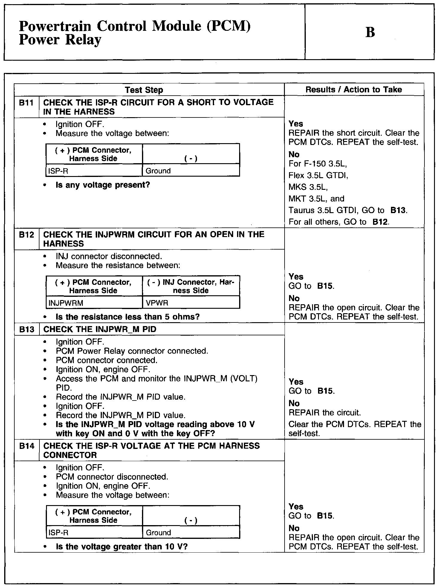 Home >> Ford >> 2011 >> Ranger 2WD L4-2.3L >> Repair and Diagnosis >> Powertrain Management >> Computers and Control Systems >> Testing and Inspection >> Pinpoint Tests >> Test B: Powertrain Control Module (PCM) Power Relay
