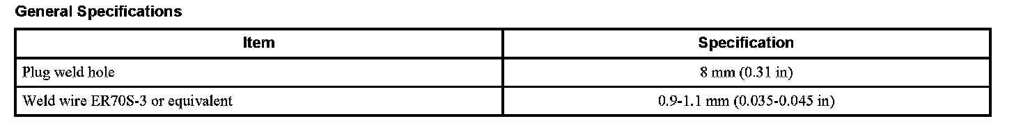 - Factory spot welds may be substituted with either STRW or MIG plug welds. Spot/plug welds should equal factory welds in both location and quantity. Do not place a new spot weld directly over an original weld location. Plug weld hole should equal 8 mm (0.31 in) diameter.