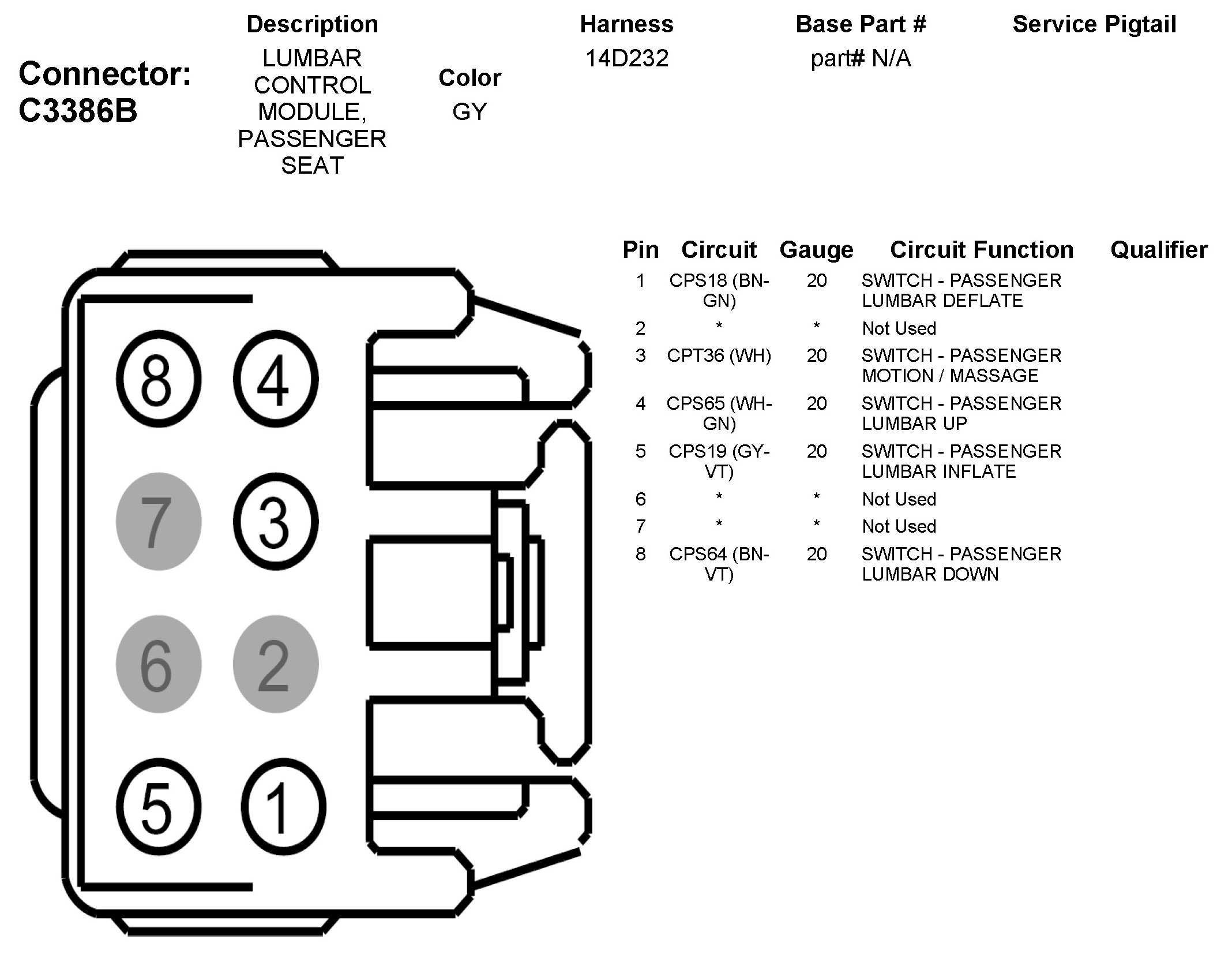Home >> Ford >> 2011 >> Taurus AWD V6-3.5L >> Repair and Diagnosis >> Diagrams >> Connector Views >> Power Seat Control Module >> C3386B Lumbar Control Module, Passenger Seat