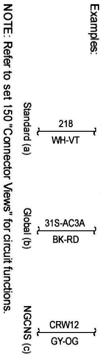 Connector Views show the views of the pins and/or cavities of all connectors. The pin and cavity sides are shown separately as if the connector were disconnected. The color of the connector housing is indicated next to the connector number when available. The harness causal number is located above the connector view and below the connector number. The circuit function charts are located below each connector. The wiring harness designations are listed in Component Location Charts.