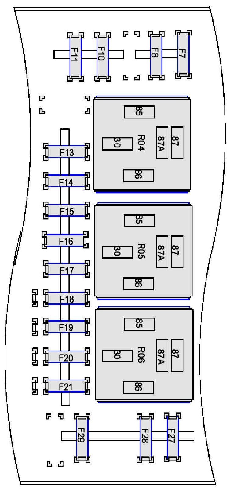 Fuse/Locations and Relay/Locations contains a view of the fuse/relay box, in which all fuses and relays are identified, numbered and named. Fuse and relay numbering and naming follow the indication of the fuse panel cover. In addition, for all removable relays, pin positions are added to illustrate proper orientation.