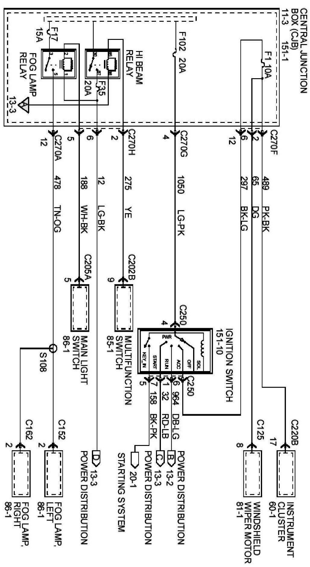Each set normally starts with the component that powers the circuit, such as a fuse or the ignition switch. Current flow is shown from the power source at the top of the diagram to ground at the bottom of the diagram. A full representation of the power supply of a fuse or the power distribution from a fuse to various components is given in the Power and Ground Distribution Diagrams. Full representation of the ground connections are shown in the Power and Ground Distribution Diagrams.