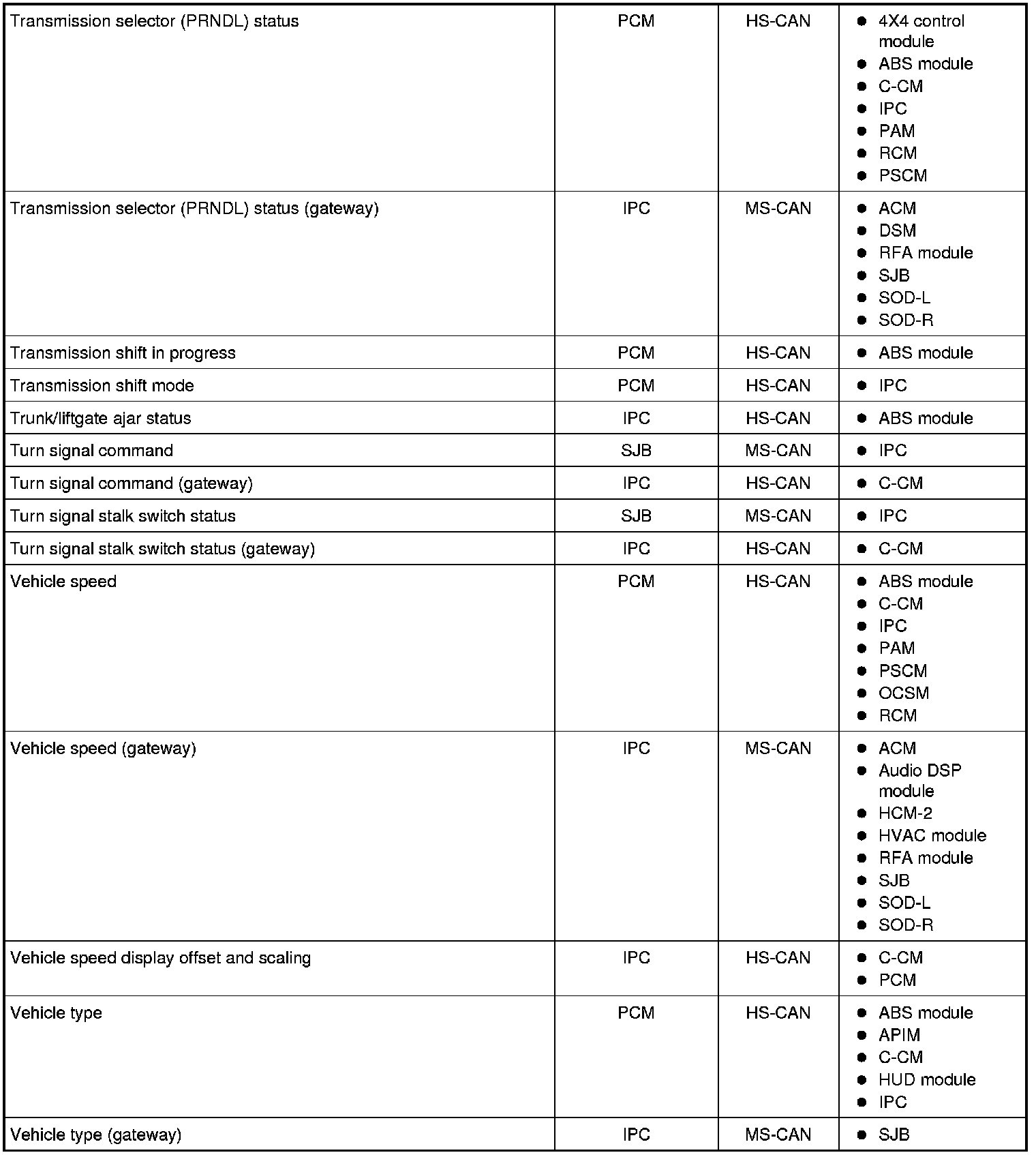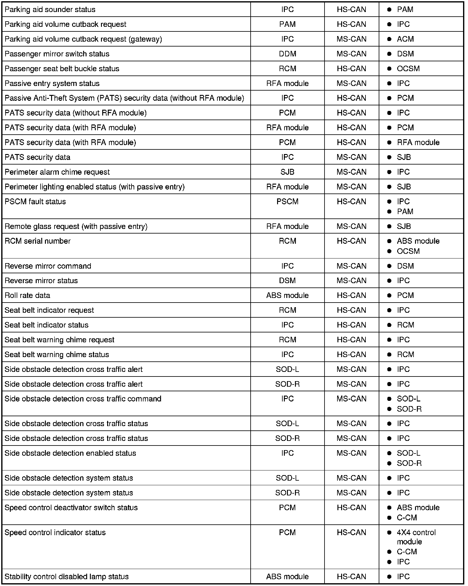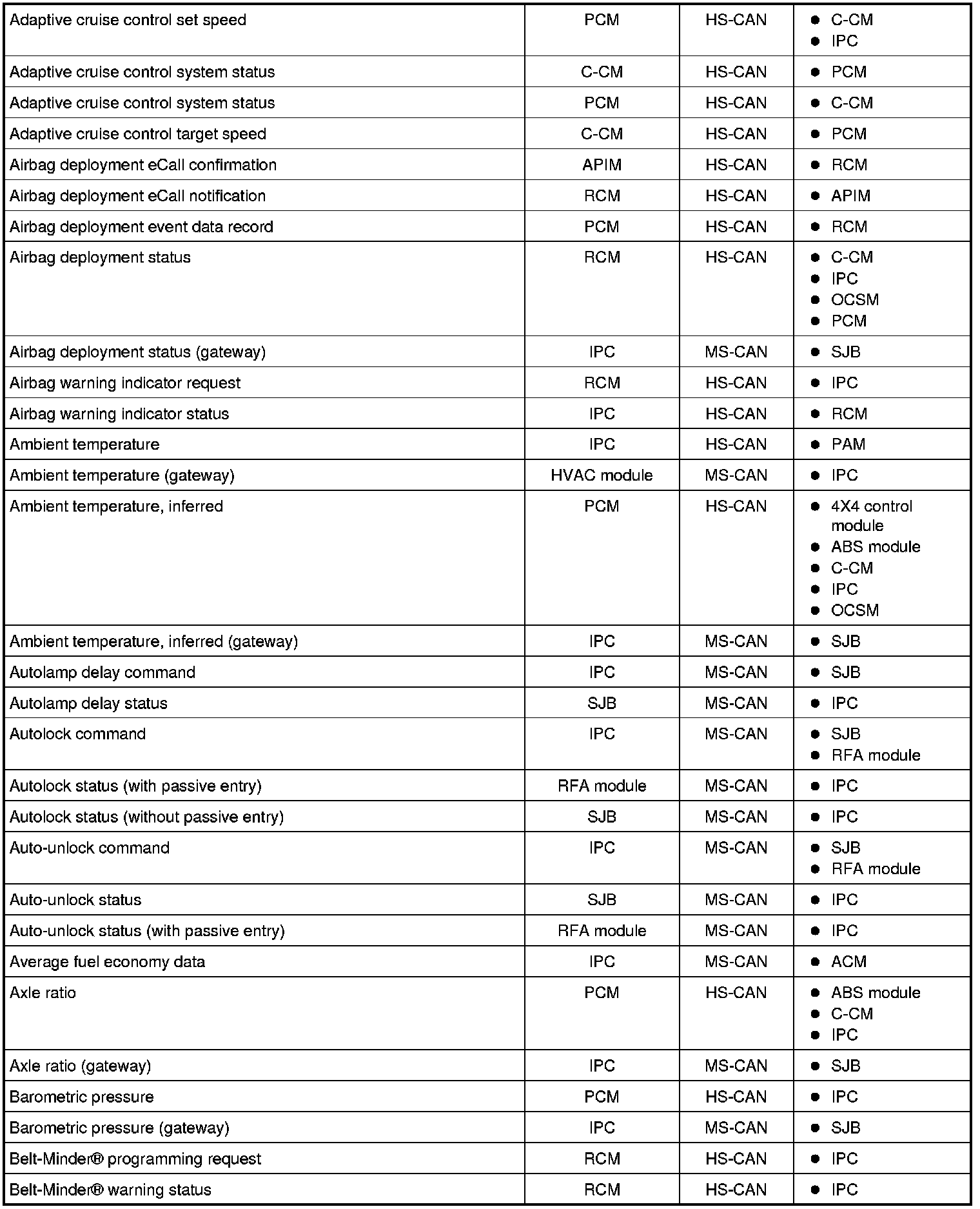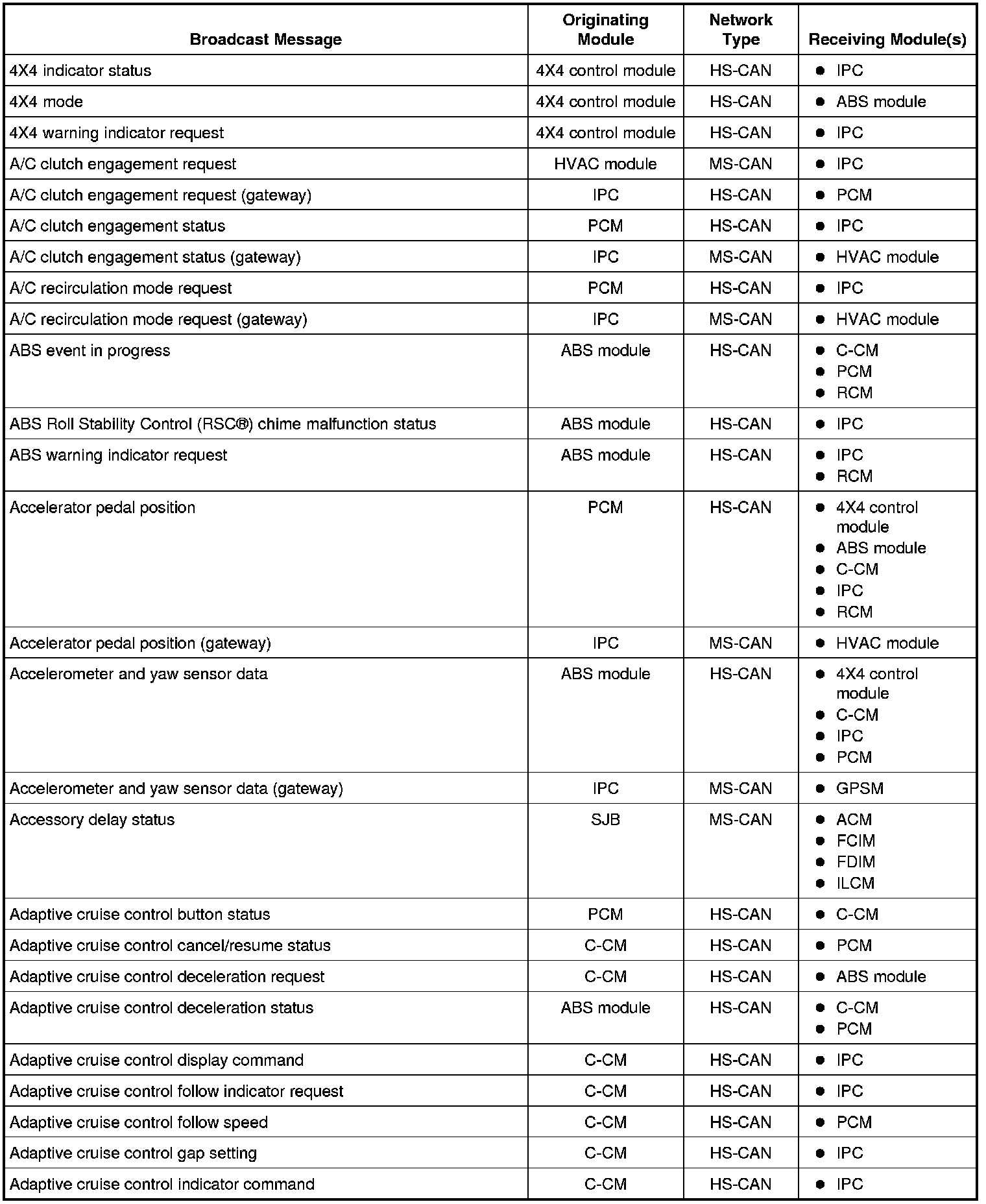 NOTE: This chart describes the specific HS-CAN and MS-CAN messages broadcast by each module, and the module(s) that receive the message.