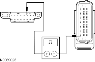 - Measure the resistance between the ABS module C135-38, circuit GD120 (BK/GN), harness side and ground.