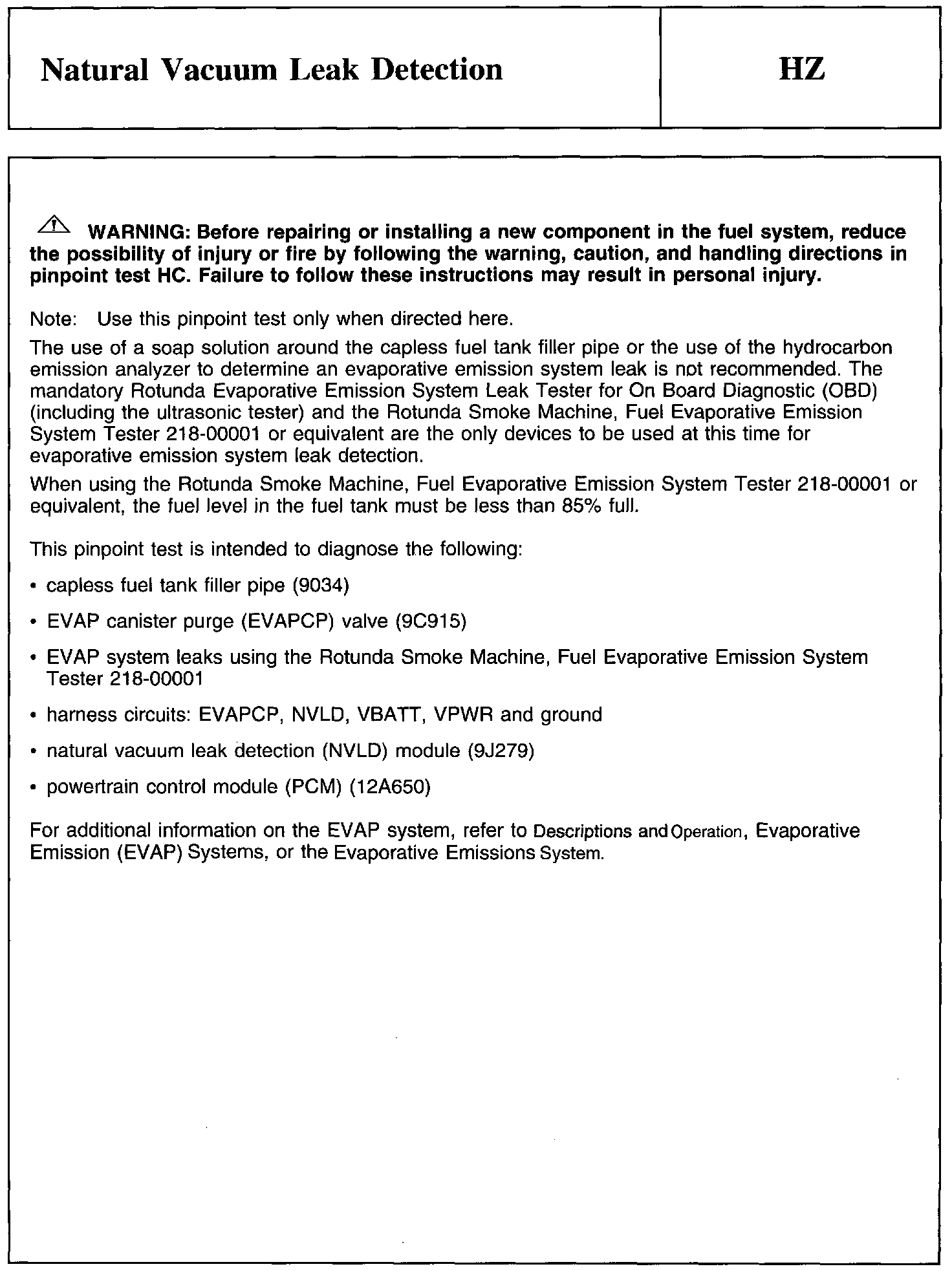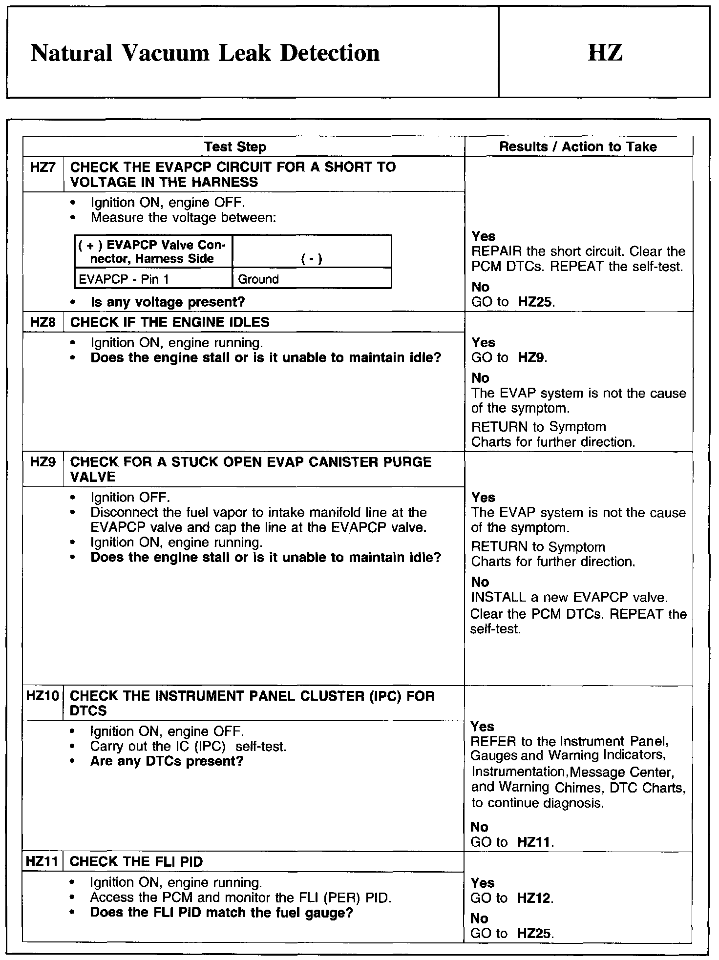 Home >> Ford >> 2011 >> Taurus AWD V6-3.5L >> Repair and Diagnosis >> Powertrain Management >> Computers and Control Systems >> Testing and Inspection >> Pinpoint Tests >> Test HZ: Natural Vacuum Leak Detection