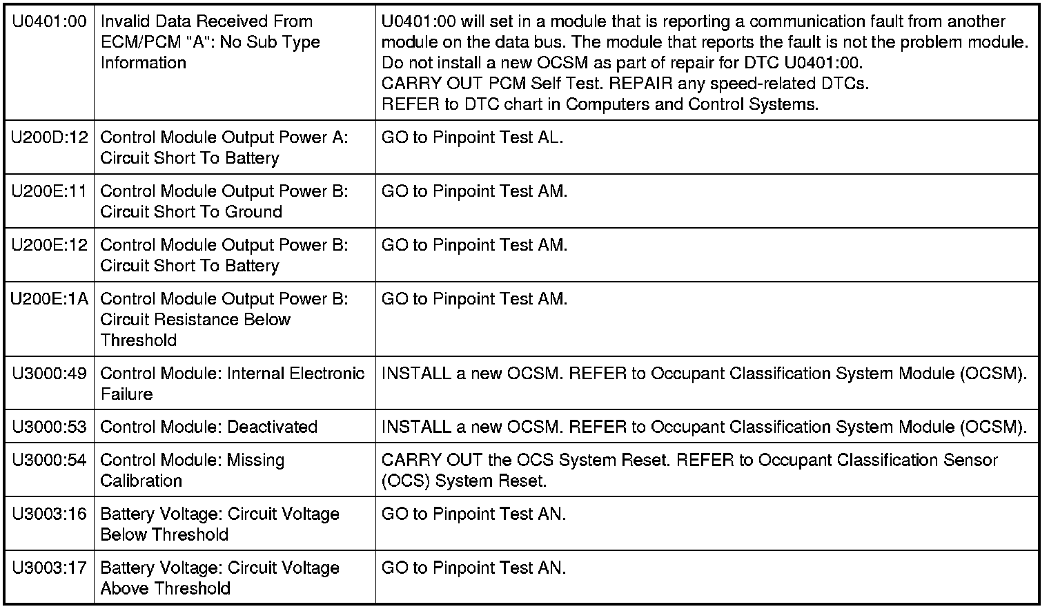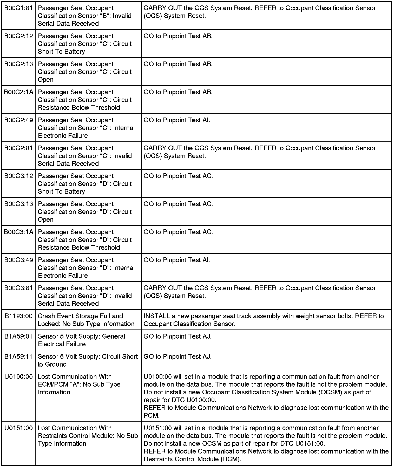 Occupant Classification System Module (OCSM) DTC Chart - Weight Sensor Bolt System