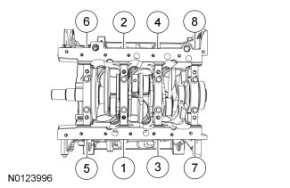 Install the new 8 main bearing cap side bolts. Tighten in the sequence shown in 2 stages.