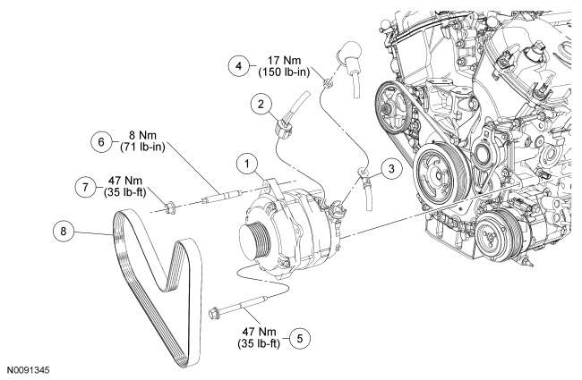 - Tighten the generator nut to 47 Nm (35 lb-ft).