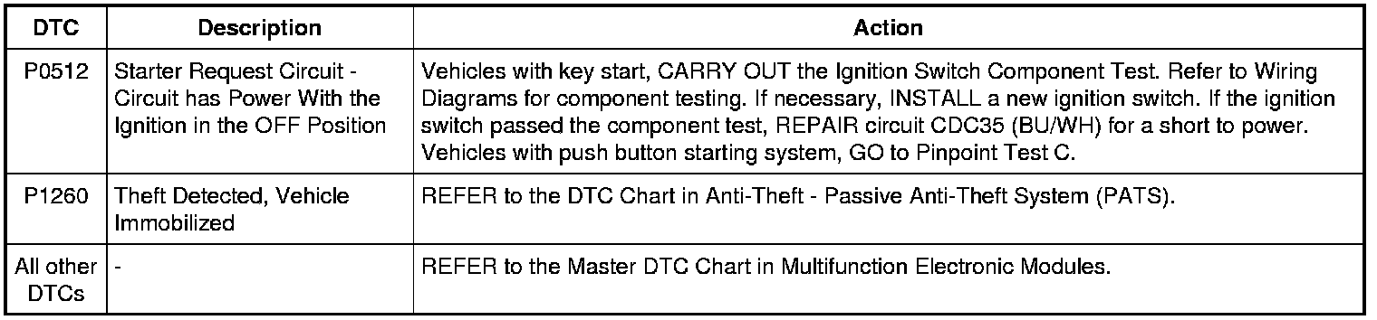 Home >> Ford >> 2011 >> Taurus AWD V6-3.5L >> Repair and Diagnosis >> Starting and Charging >> Starting System >> Testing and Inspection >> Diagnostic Trouble Code Tests and Associated Procedures >> PCM DTC Chart