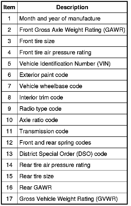 The Vehicle Identification Label (VIL) contains the manufacturer name, the month and year of manufacture and the Vehicle Identification Number (VIN). It also includes Gross Vehicle Weight Rating (GVWR) and tire information.