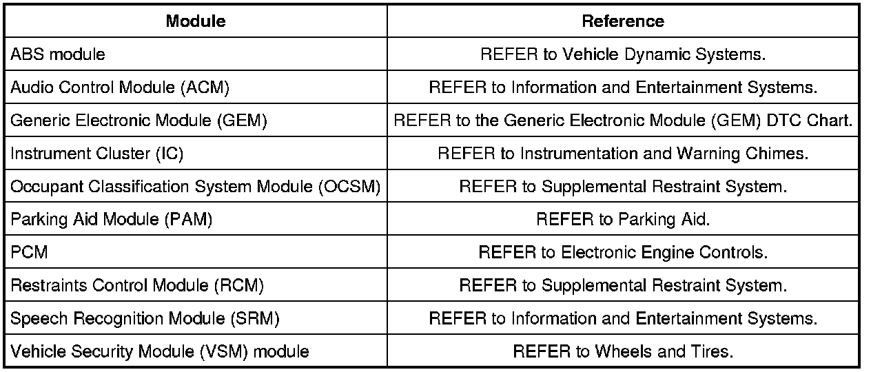 Each module has a comprehensive DTC chart listed in the appropriate information.. Refer to the table below for the appropriate information.