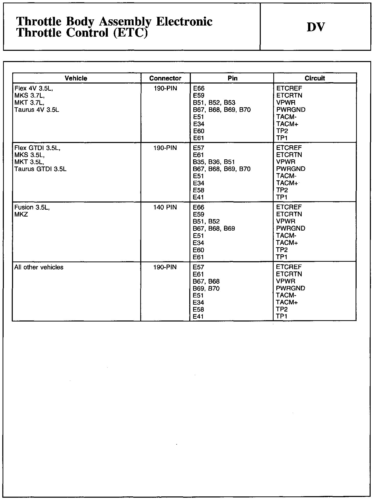 Home >> Ford >> 2011 >> Transit Connect L4-2.0L >> Repair and Diagnosis >> Powertrain Management >> Computers and Control Systems >> Testing and Inspection >> Pinpoint Tests >> Test DV: Throttle Body Assembly Electronic Throttle Control (ETC)