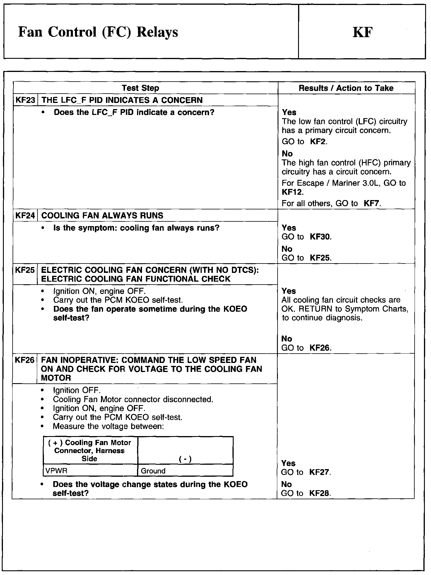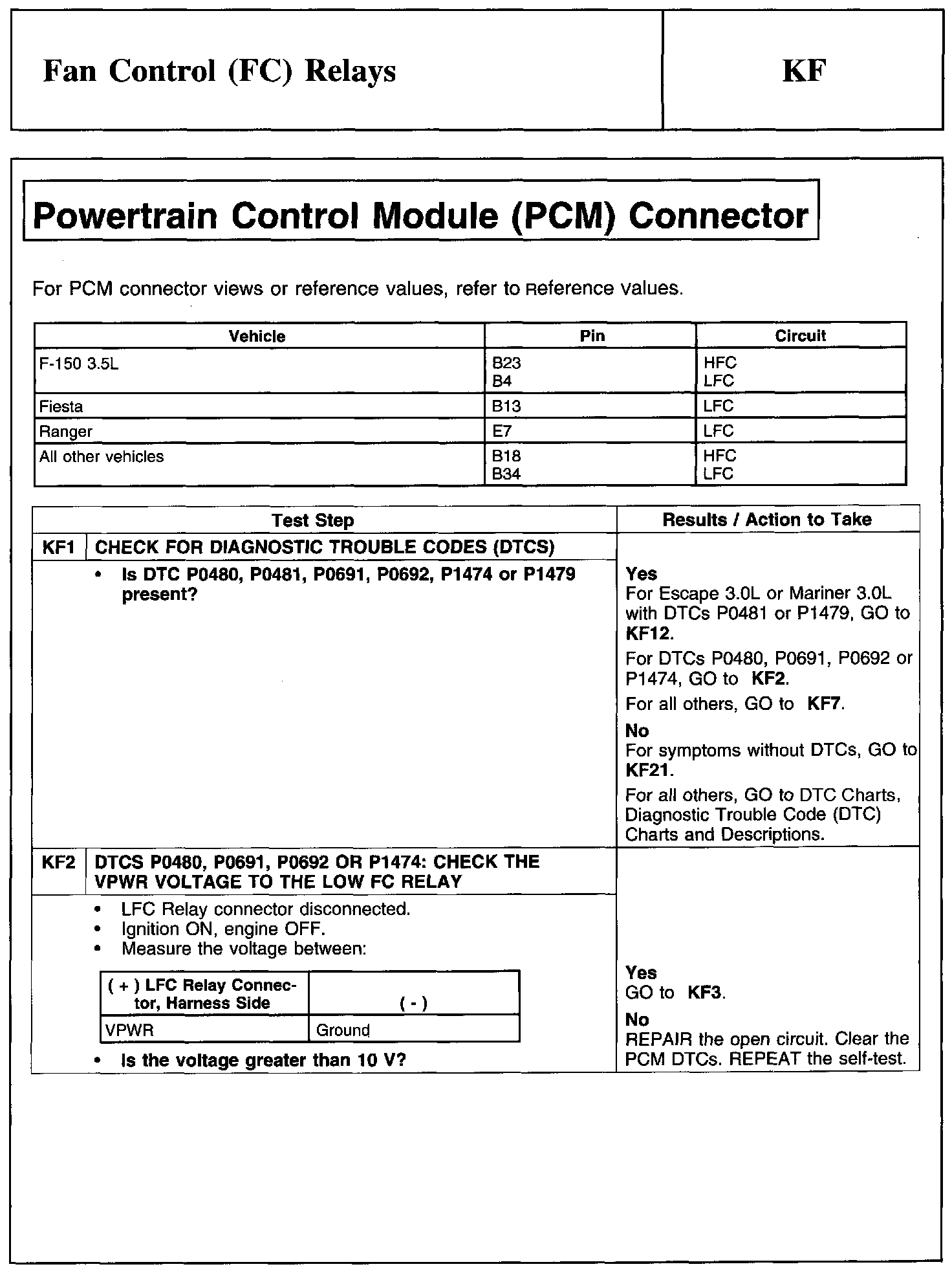 Home >> Ford >> 2011 >> Transit Connect L4-2.0L >> Repair and Diagnosis >> Powertrain Management >> Computers and Control Systems >> Testing and Inspection >> Pinpoint Tests >> Test KF: Fan Control (FC) Relays