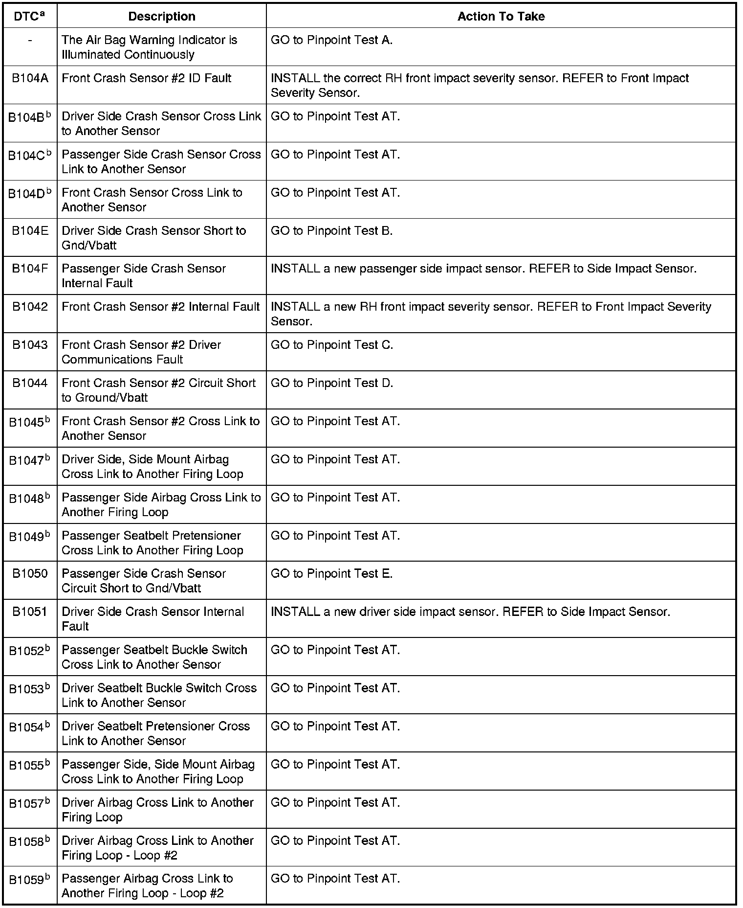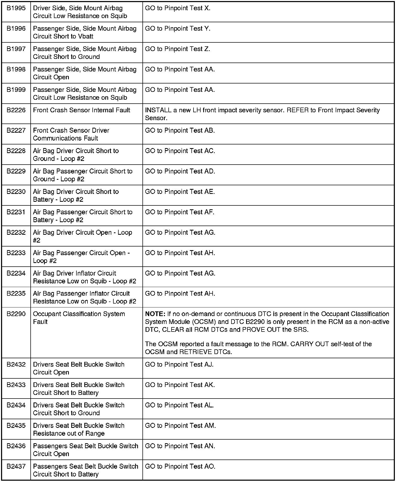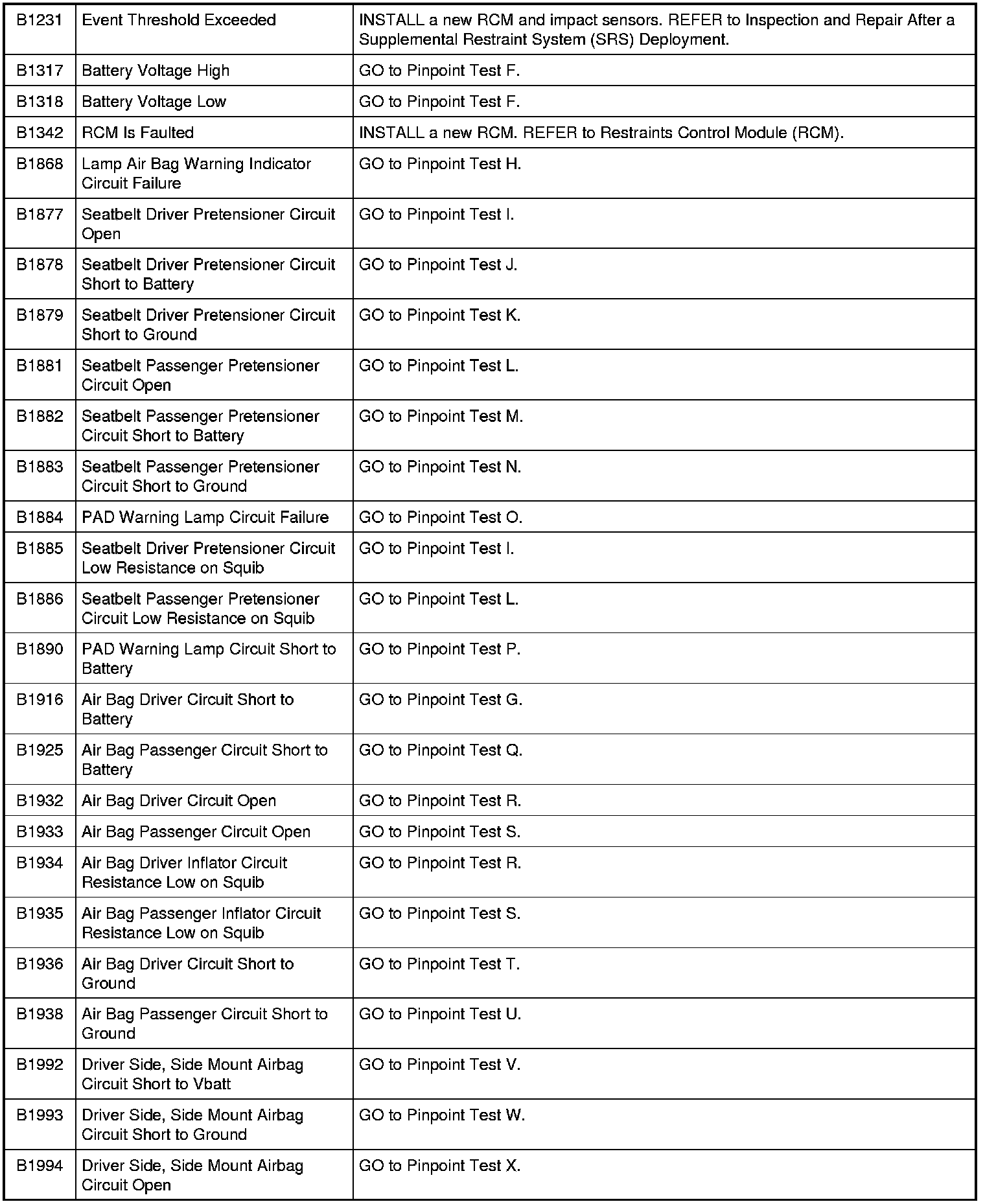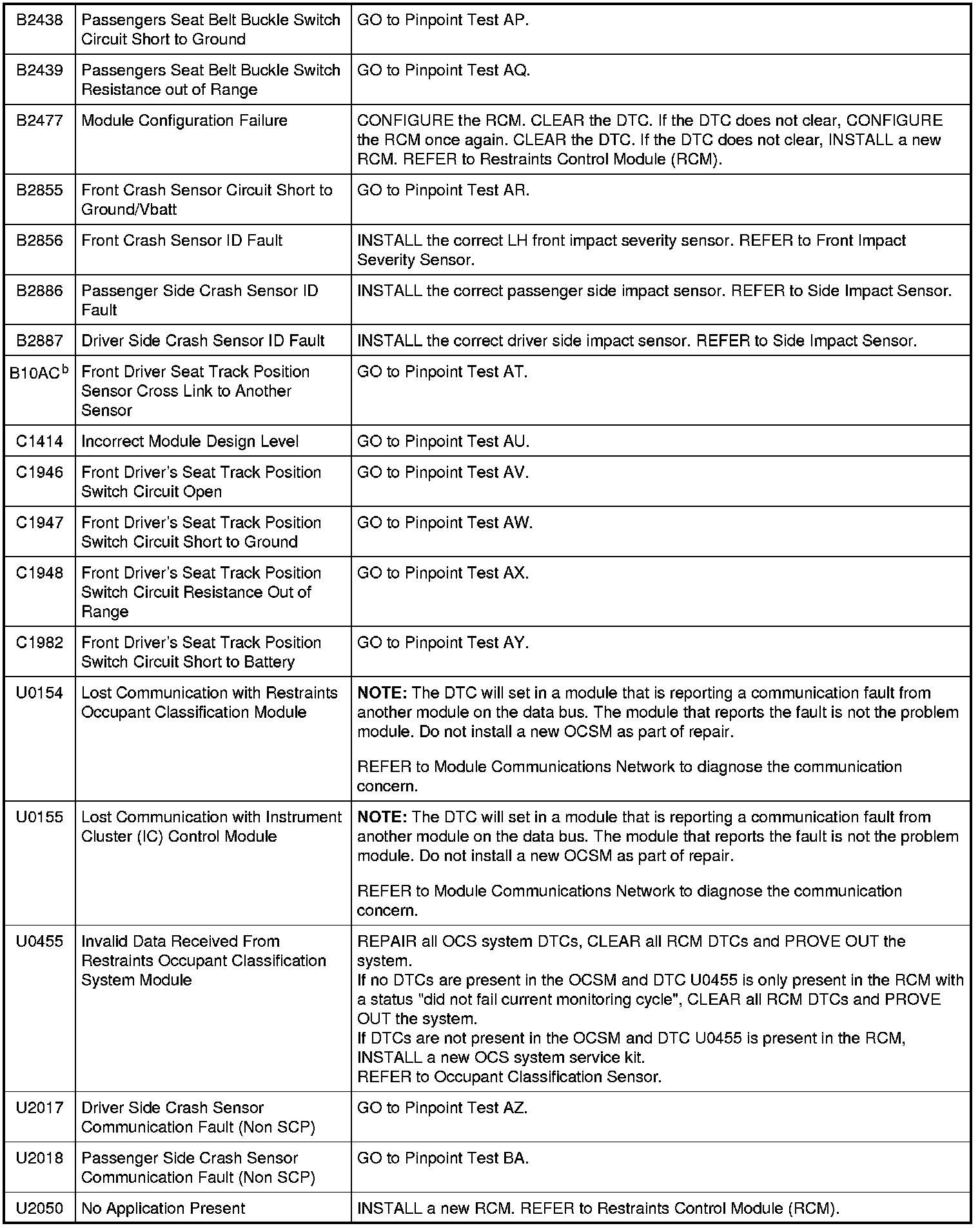 Restraints Control Module (RCM) DTC Chart