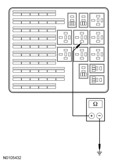 - Measure the resistance between rear window defrost relay socket pin 86, circuit 15S-HB20 (GN/BK), harness side and ground.
